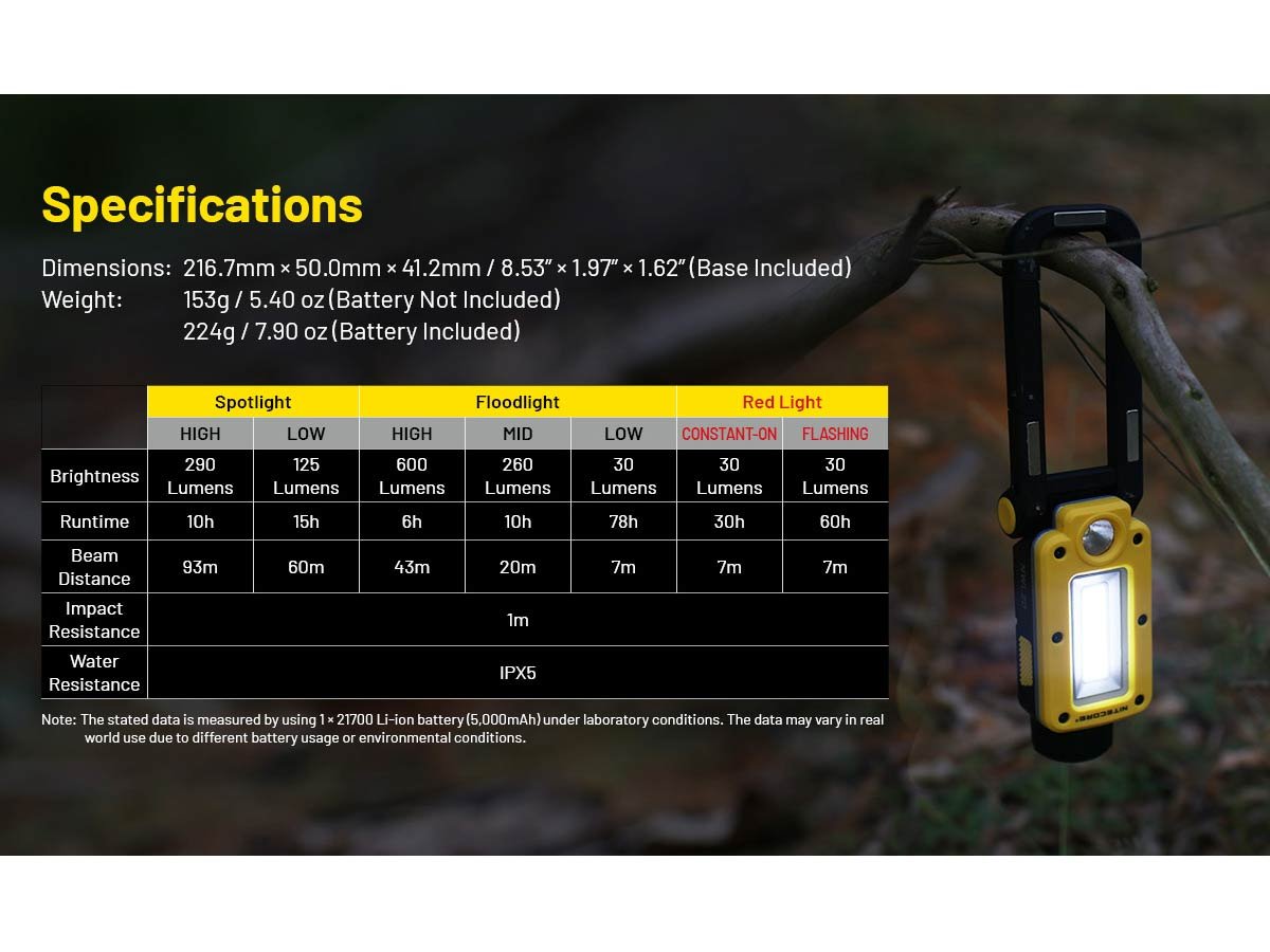 The NWL20 has both a spotlight and floodlight for focused or wide-area illumination as needed. Both light sources support long runtimes and multiple modes, with the floodlight capable of operating for 78 hours on a single charge. Add in 2 red light outputs including flashing light, and you are prepared to preserve natural night vision or signal for help in emergencies.