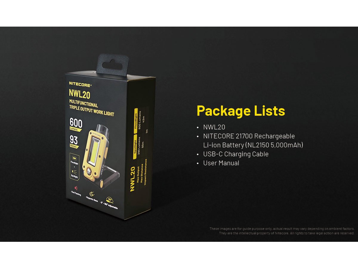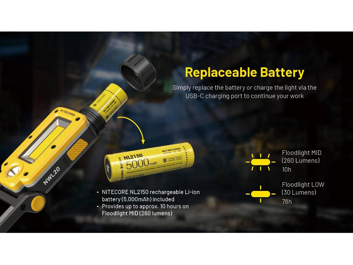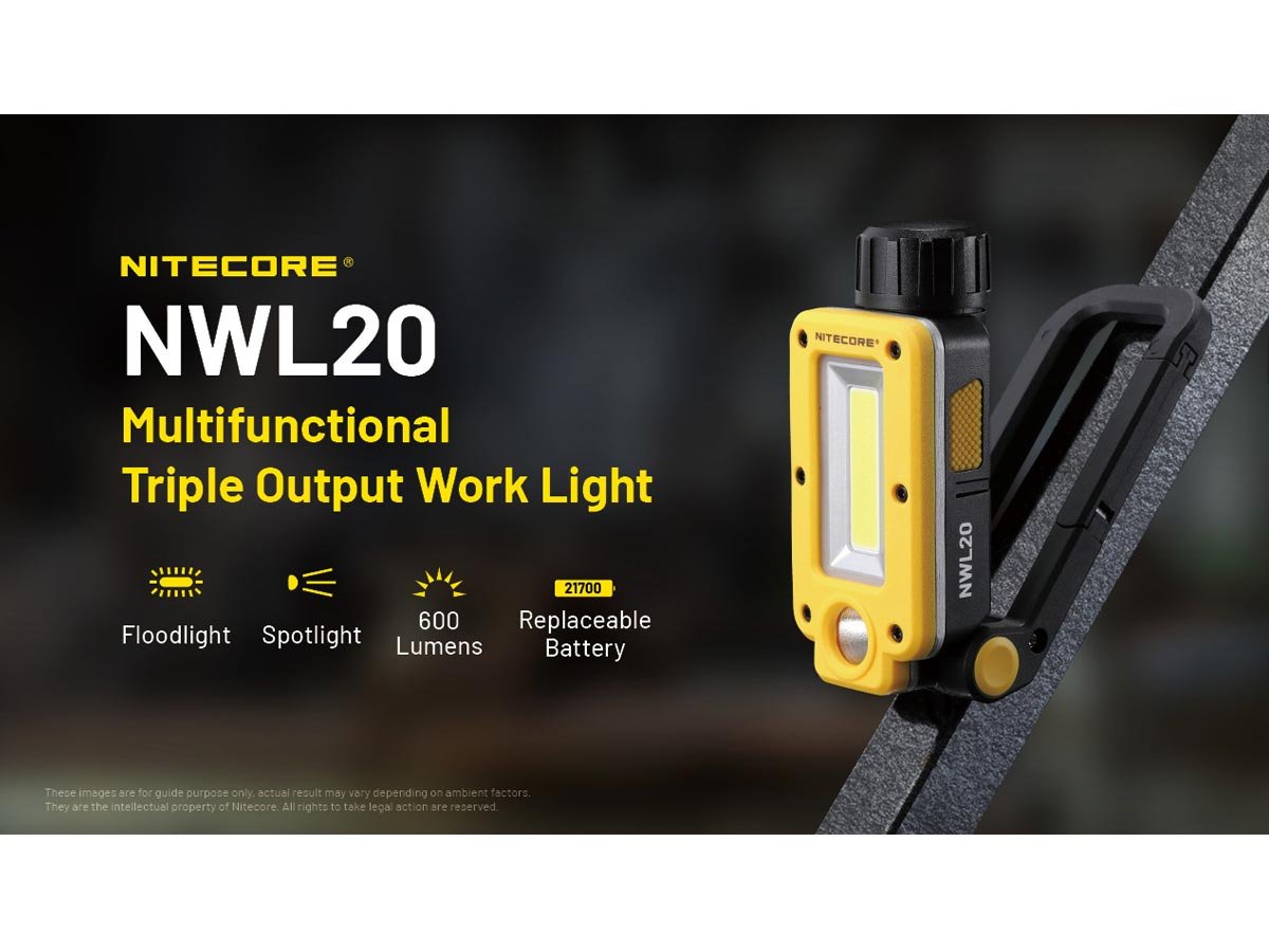 Nitecore NWL20 Triple Output USB-C Rechargeable LED Work Light - 600 Lumens - Includes 1 x 21700