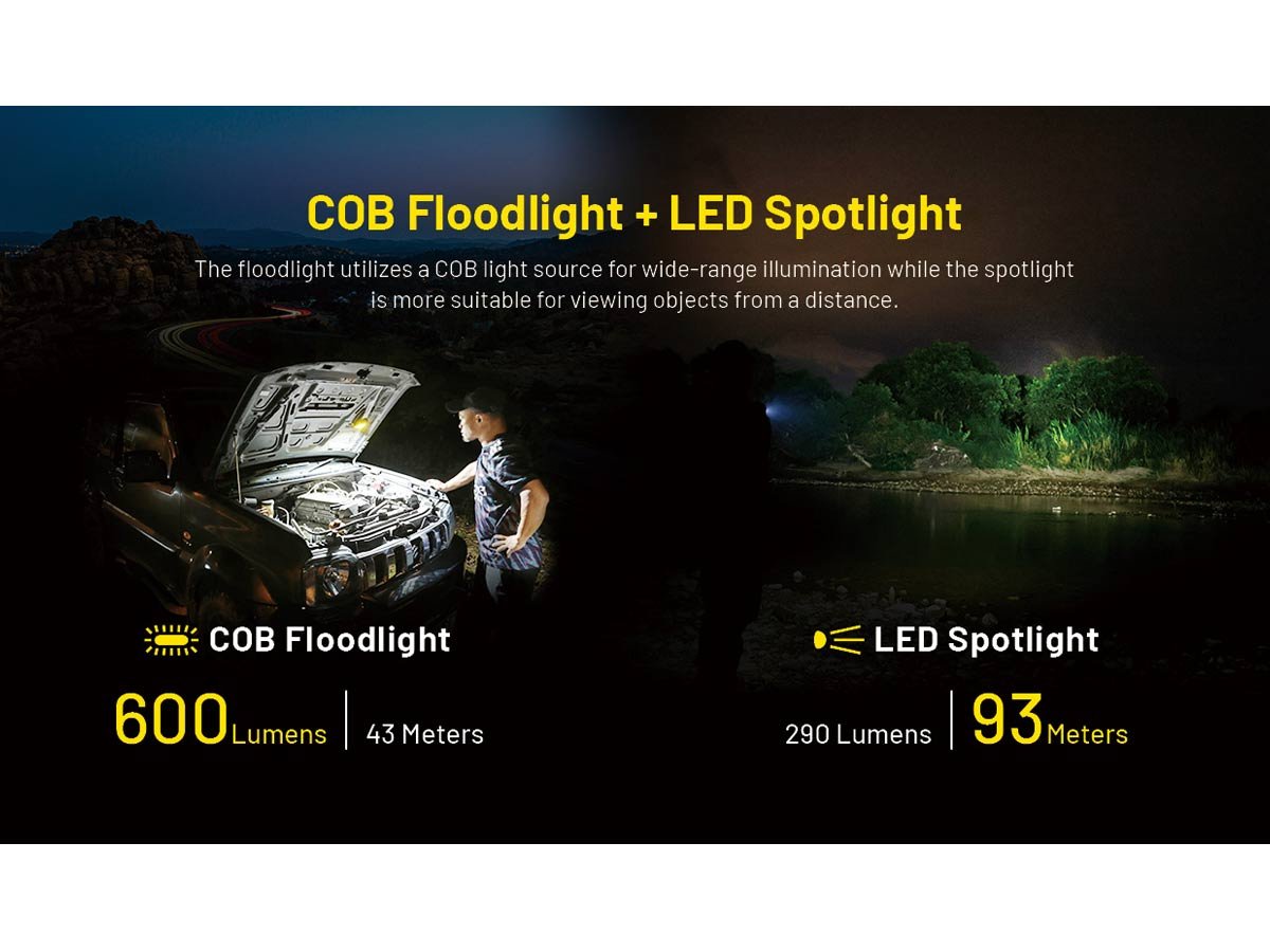 - » LED spotlight and COB floodlight provide focused or wide-angle illumination as needed