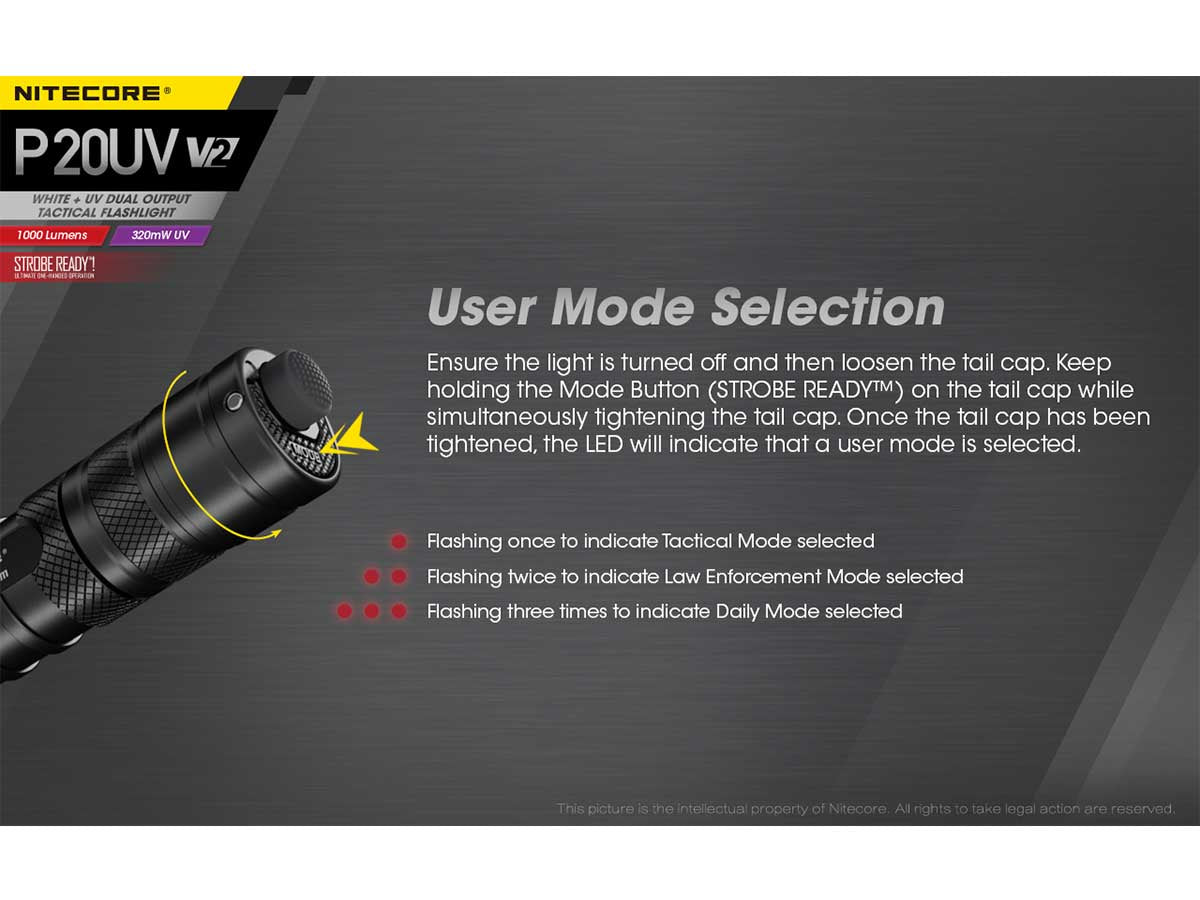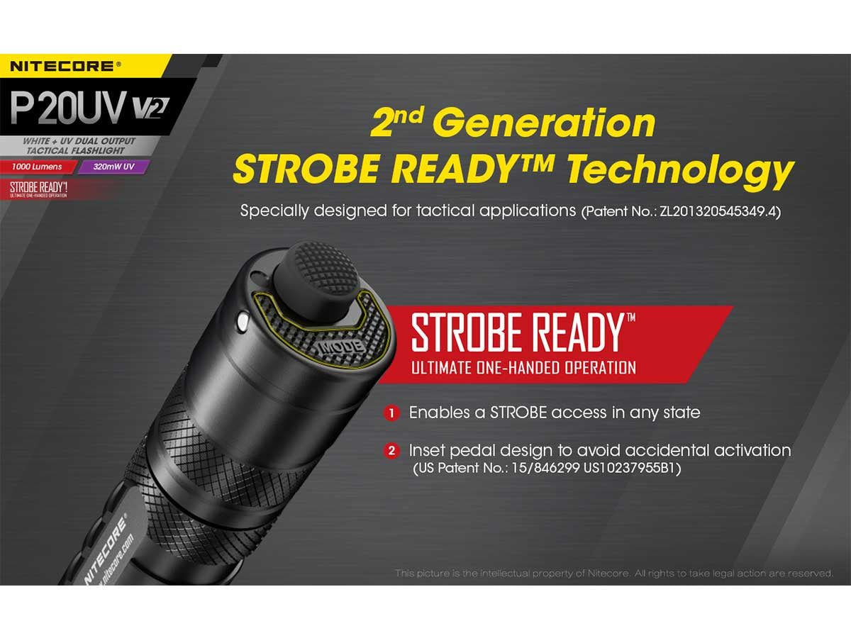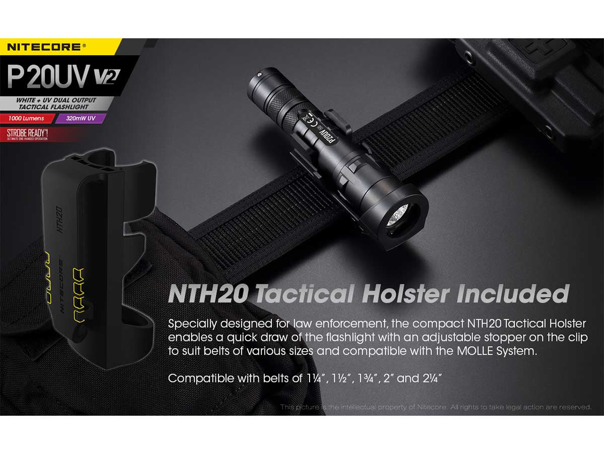 Designed for funcitonal operation in tactical situations, the P20 UV V2 is truly ready for action when you need it most. Its dual tactical tail switch is a simple, effective interface that inclused a Strobe Ready™ tab button that keeps a defensive strobe just a light press away. Included with the P20UV V2 is an NTH20 tactical holster which is compatible with most belts and MOLLE systems, and allows for quick drawing in tense situations.