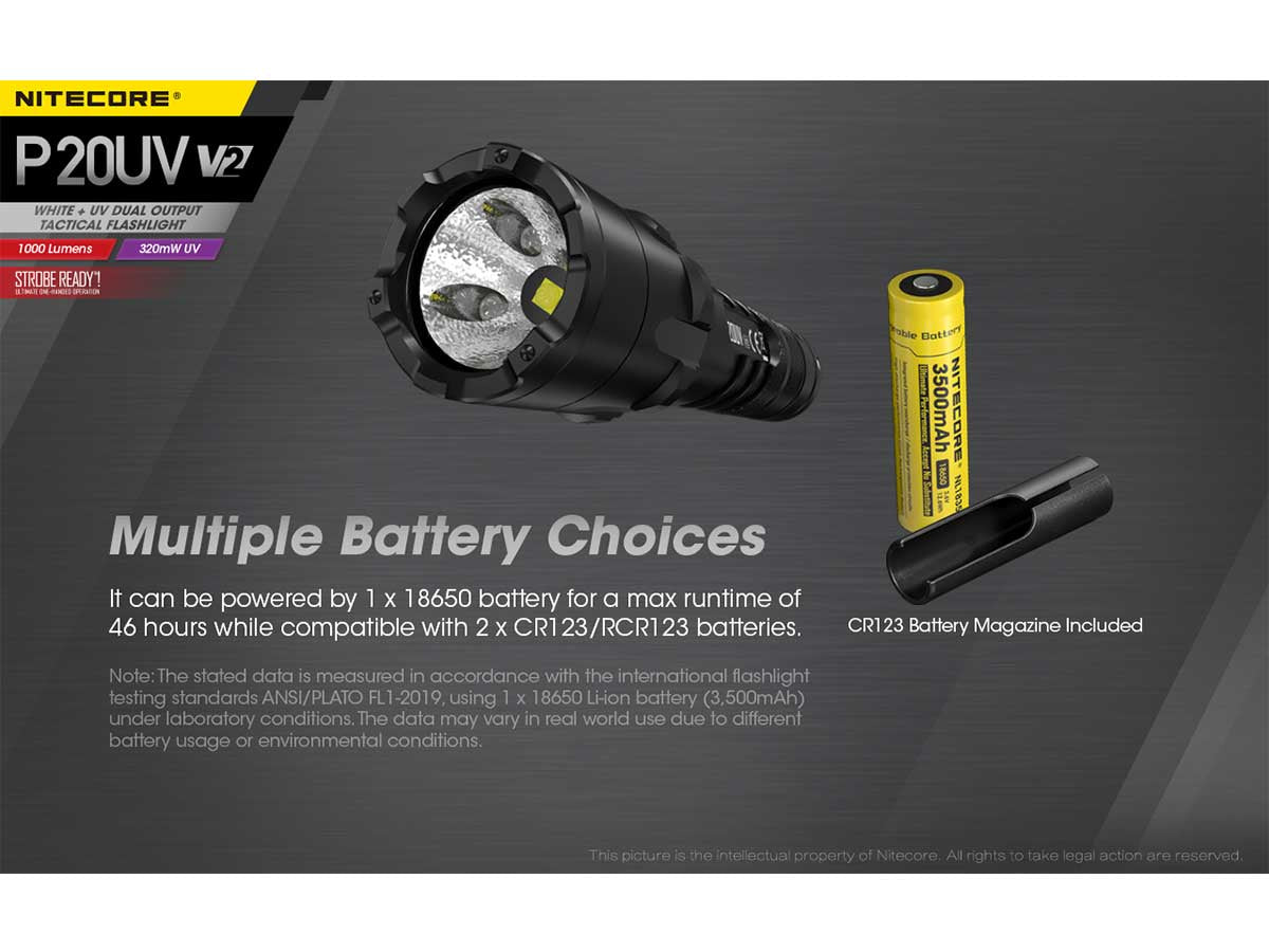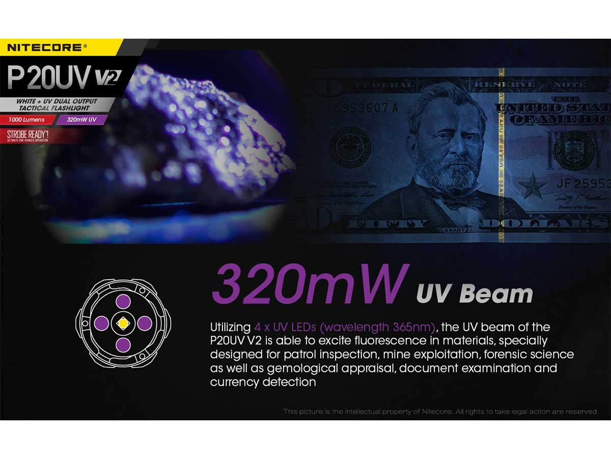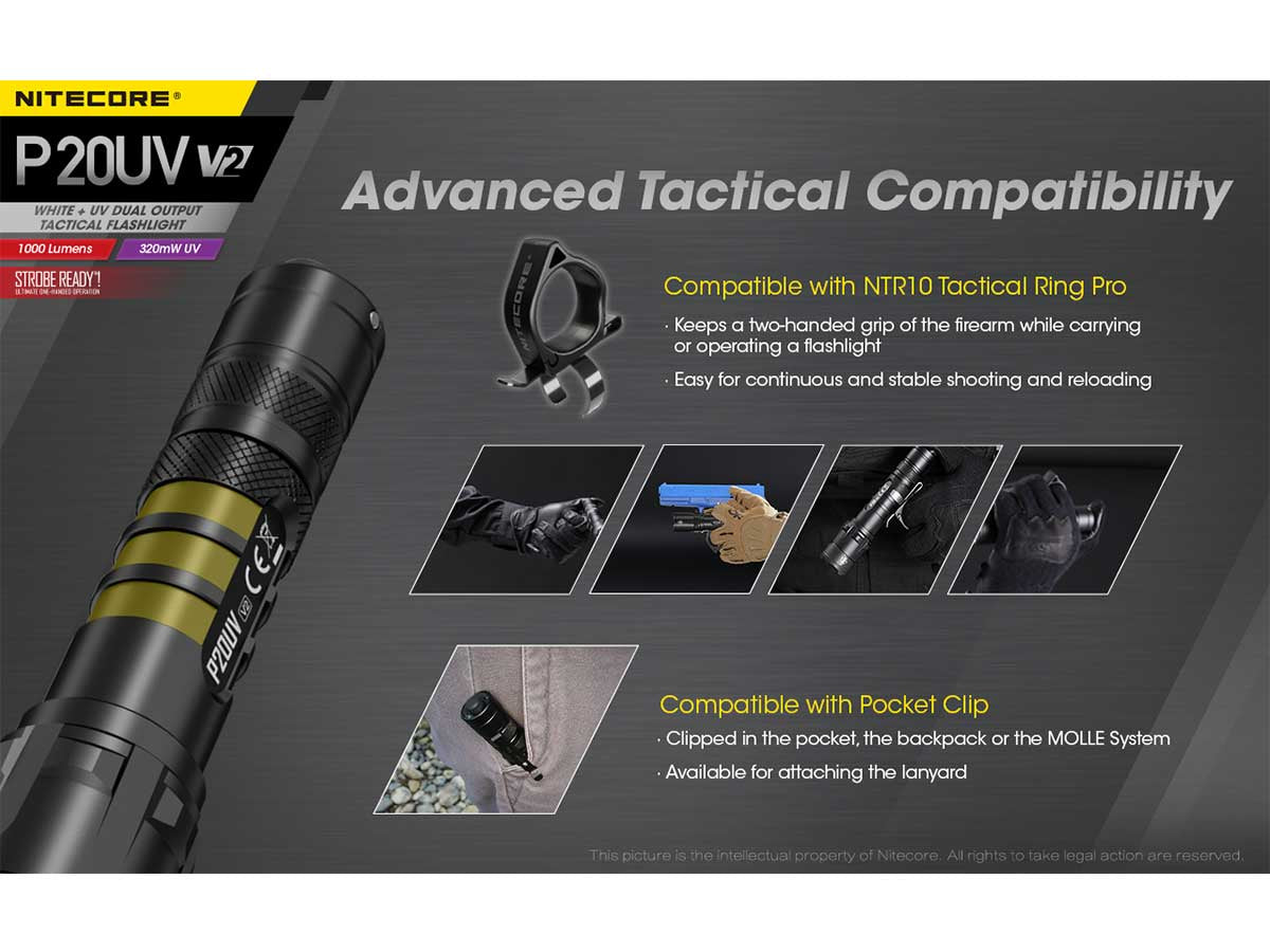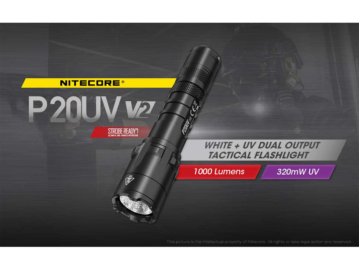 Nitecore P20 UV V2 Dual Output Tactical LED Flashlight - 1000 Lumens - 320mW UV Beam - CREE XP-L2 V6 - Uses 1 x 18650 or 2 x CR123A or 2 x RCR123A