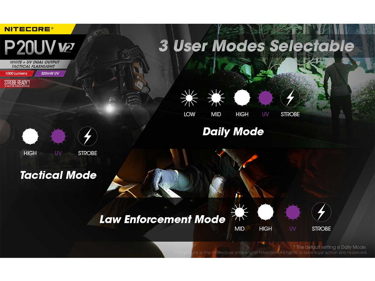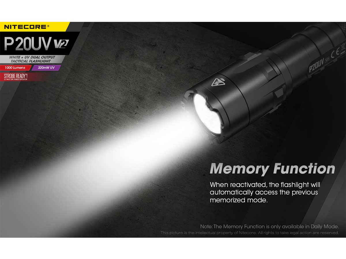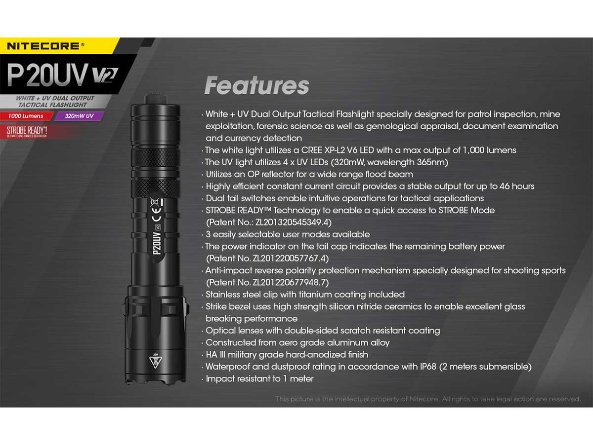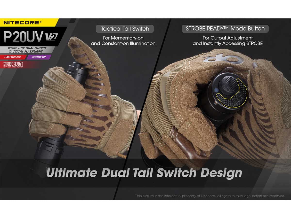 Nitecore P20 UV V2 Dual Output Tactical LED Flashlight - 1000 Lumens - 320mW UV Beam - CREE XP-L2 V6 - Uses 1 x 18650 or 2 x CR123A or 2 x RCR123A