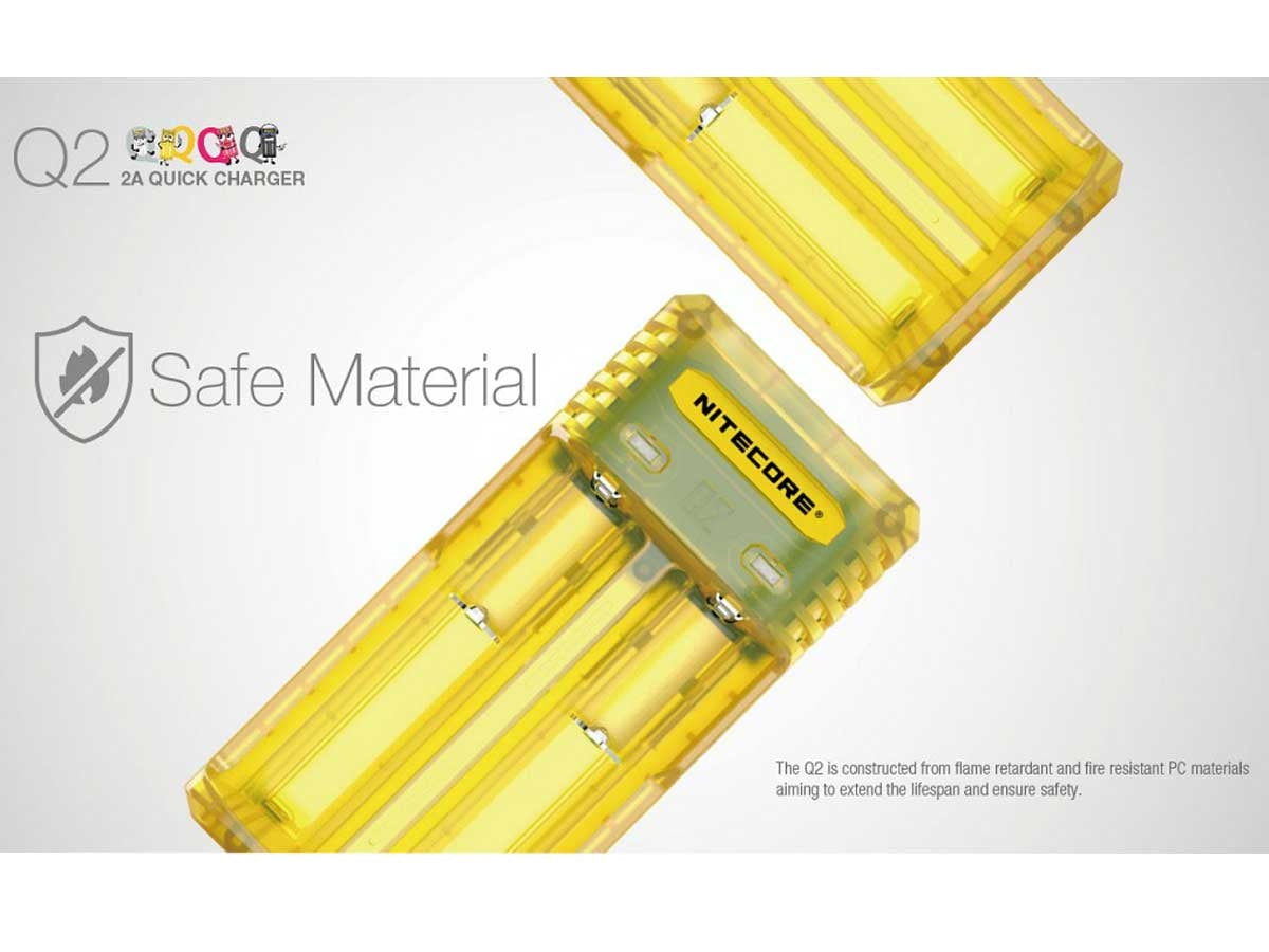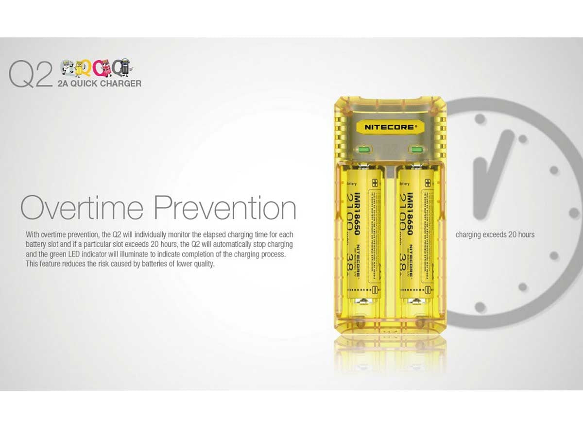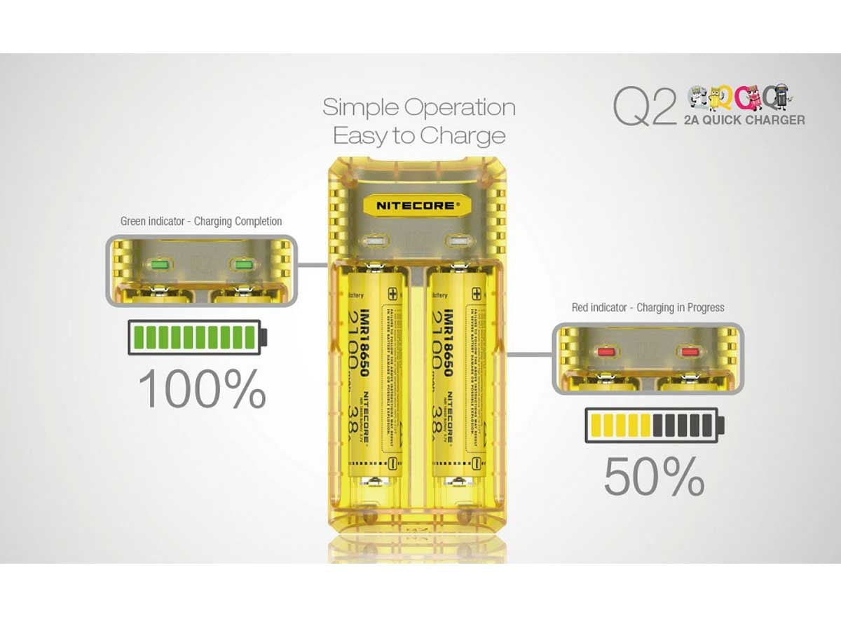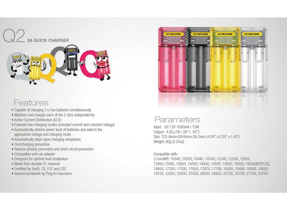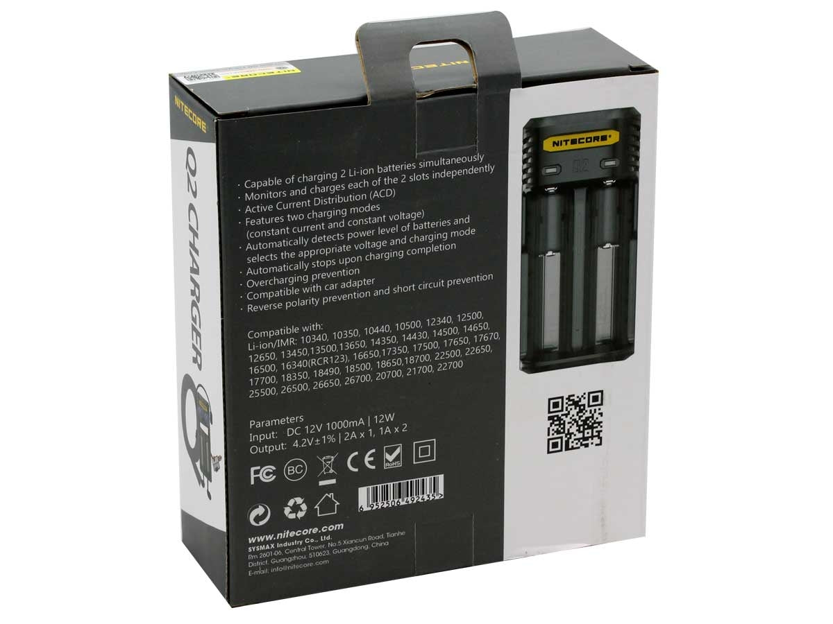 The Nitecore Q2 Quick Charger offers the newest technology available in the battery charger market. The Q2 features reverse polarity and short circuit prevention and a LED charging status indicator. Putting batteries into a charger can cause irreversible damage to your batteries and possibly cause a shortage. The Q2 Quick Charger can prevent these types of damages and ensure a longer lifespan of your batteries.