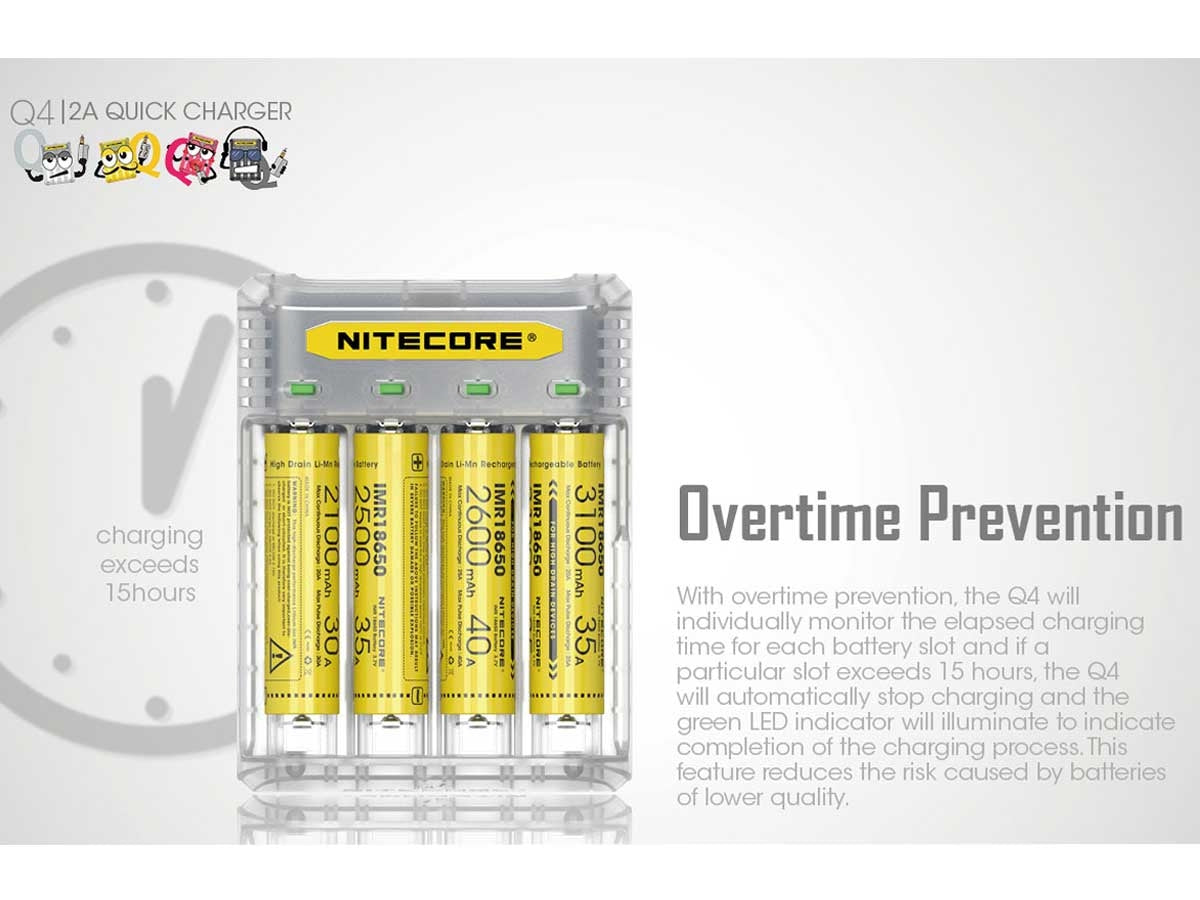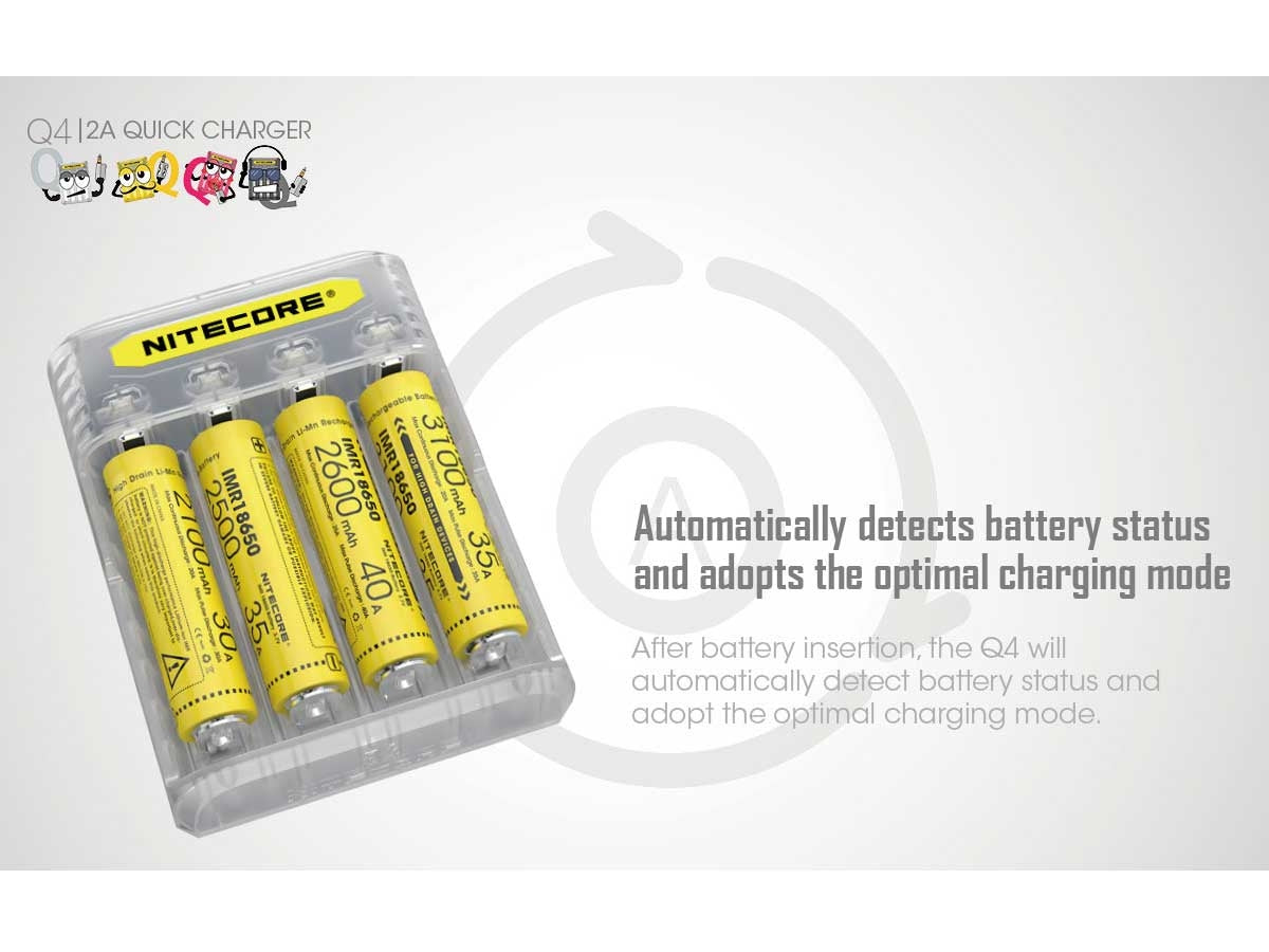 The Nitecore Q4 Quick Charger offers new innovations in the battery charger community. The charger utilizes four bays to independently charge different batteries simultaneously. It has the technology to measure and apply the proper current needed for the type of battery in each individual slot. For example you can charge a 2100mAh battery and a 2600mAh battery at the same time with no harm to your batteries or charger. Moreover, the Nitecore Q4 Quick Charger can provide a charging current up to 1000mA in just a single bay! With this type of current, charging takes less time than ever before. Constructed of a fire resistant PC materials the Q4 can be used to its fullest without fear of overheating or combustion. On the face of each bay is a charge indicator LED which takes the guess work out of charging. When the LED indicator is red your battery is still charging, and when it turns green then you know you are good to go!