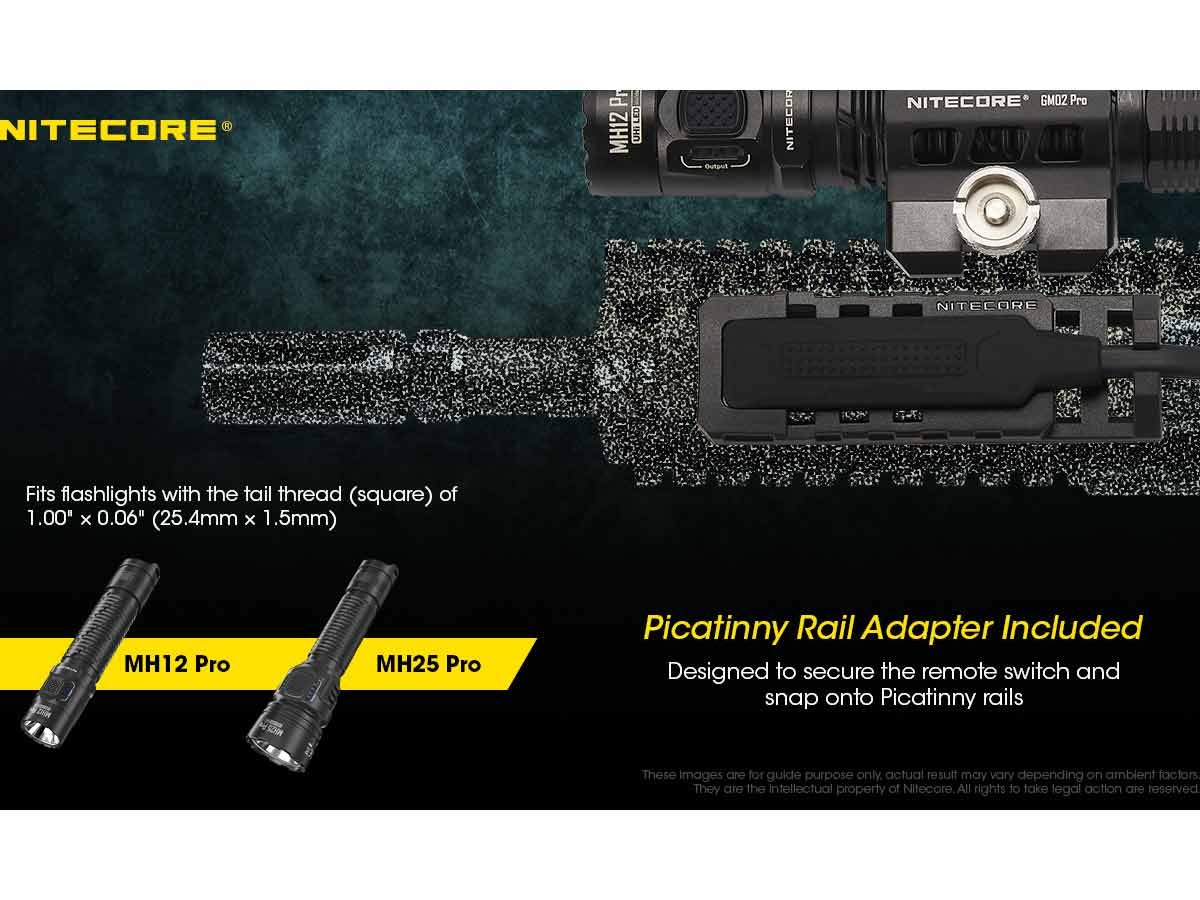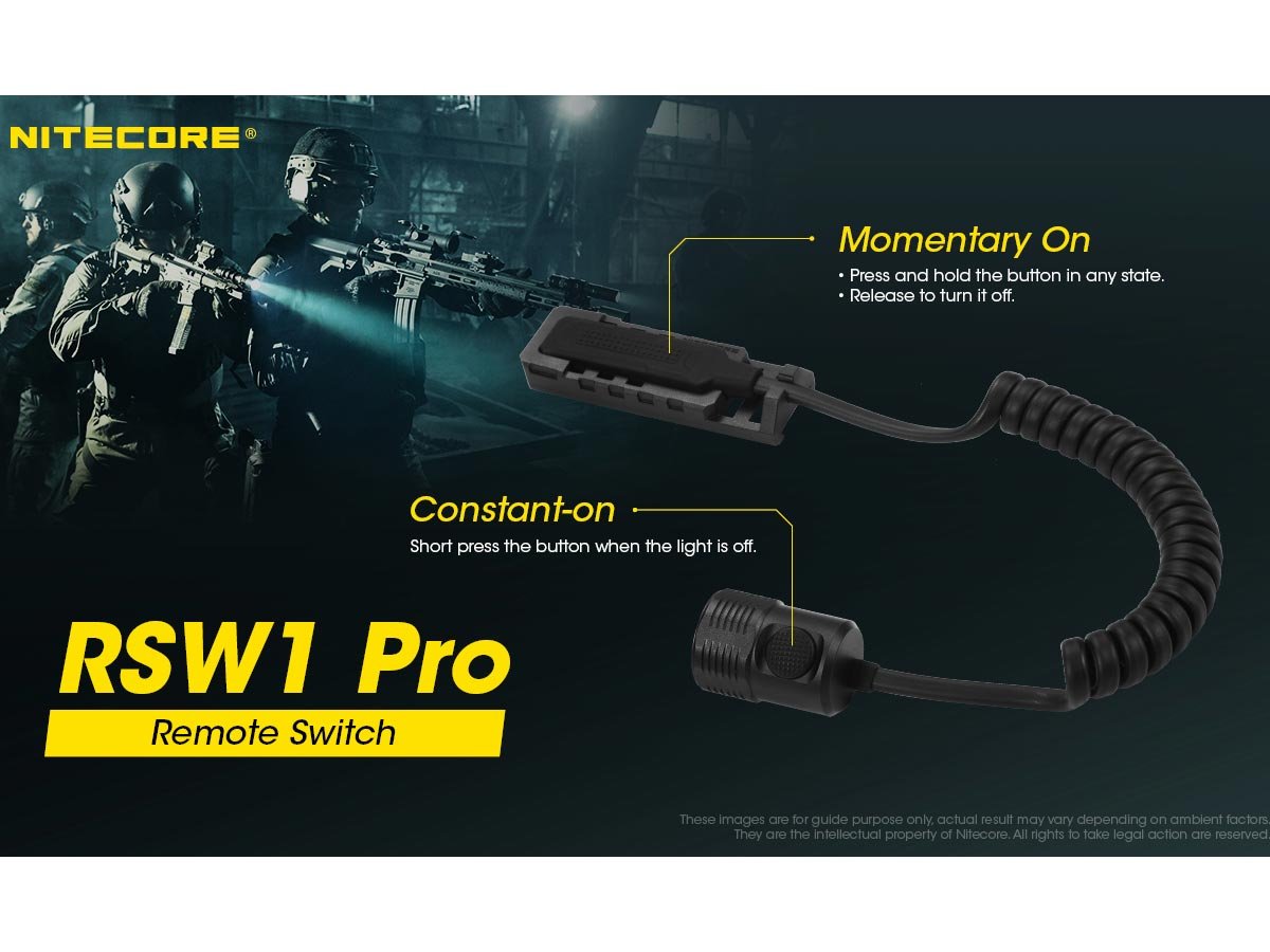 The Nitecore RSW1 Pro is a remote pressure switch that gives you discreet control over tac-lights mounted on long arms. The RSW1 Pro is compatible with any flashlight with a 1" x 0.06" tail thread, which includes the Nitecore MH12 Pro and MH25 Pro. Thanks to its dual-button design, it can activate either momentary or constant-on illumination in a flash. Included is a Picatinny rail adapter, so you can use this switch on a wide range of weapons straight out of the box!