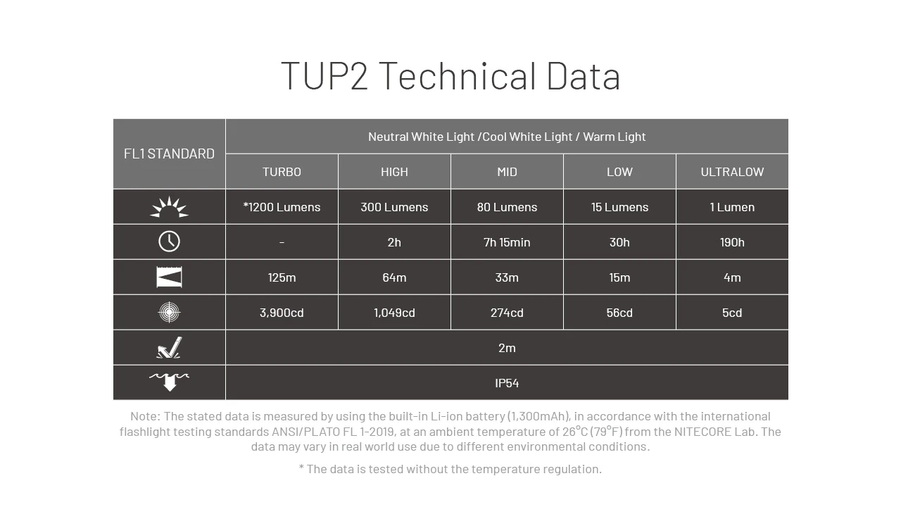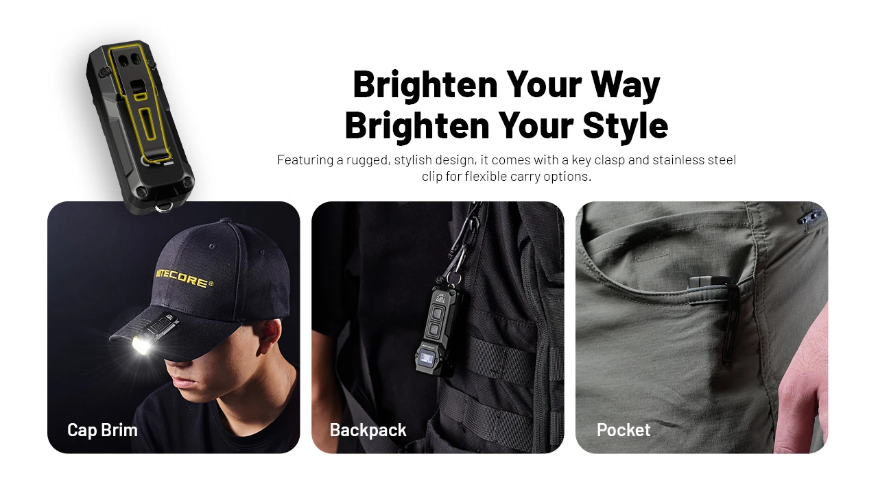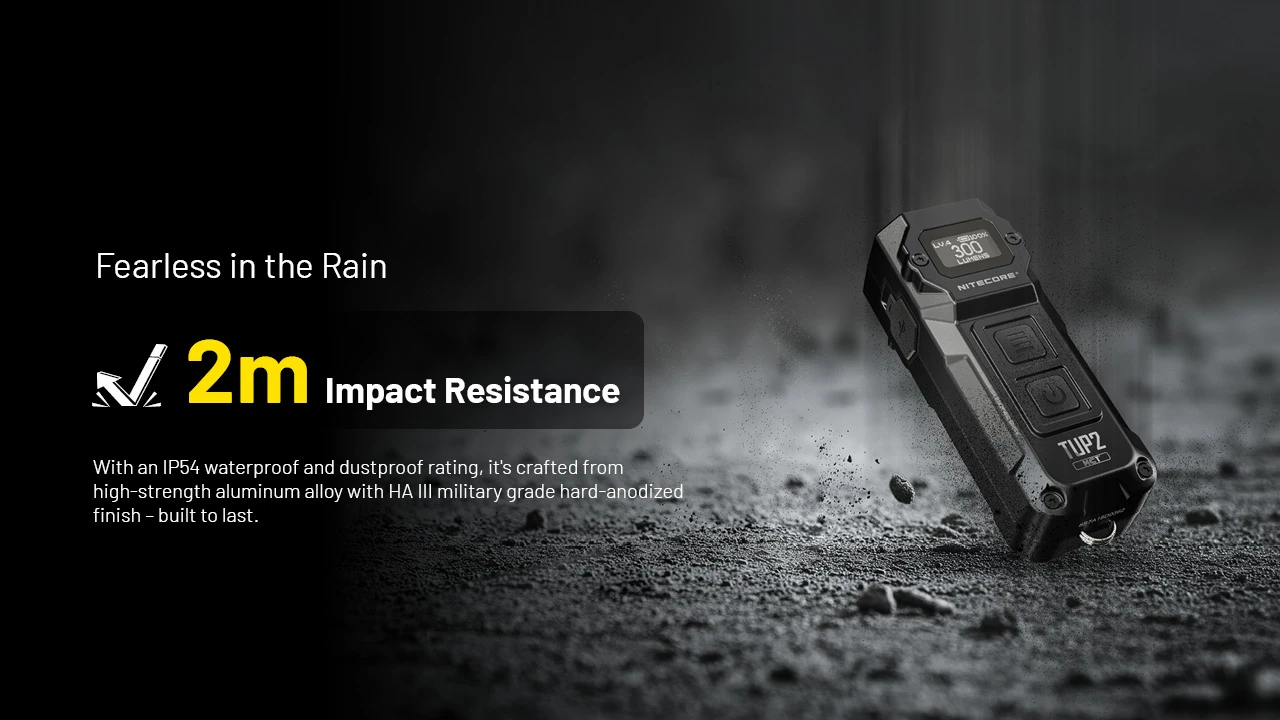The TUP 2 is solid and well-built all around. It has a strong, 1300mAh lithium rechargeable battery for runtimes reaching nearly 8 days straight, so it's even good for expeditions in the wild. Recharge quickly via the integrated USB-C port, with the ability to use the light while charging for uninterrupted illumination. The TUP 2 is made IP54 weather-safe for use in storms and industrial environments, and is also highly resistant to impacts. Highly portable thanks to its compact, lightweight design — not to mention the steel body clip and included key clasp — you can carry it anywhere with ease!