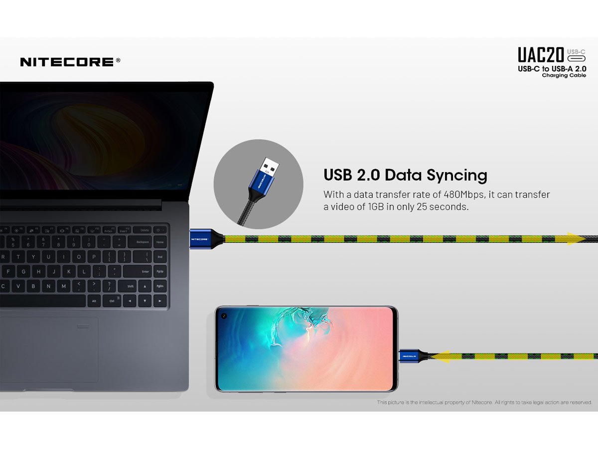 The Nitecore UAC20 is the newest full speed charging and data syncing accessory! Featuring a USB-C reversible design, never fumble or struggle plugging this cable in. It was designed to help users with mainstream device compatibility - you can use this with electronics ranging from laptops, tablets, smartphones and more! The quick 3A max charging current will get your essential devices powered in no time. Need data transferred? No problem! The transfer rate of this cable is 480 Mbps - you can transfer a video of 1 GB in 25 seconds! Built for durability and even use in outdoor environments, the high strength nylon can stand up to 1,000 bends and coils without damage. The braided nylon covering, aluminum shielding and TPE insulation ensures a wear-proof and anti-bending experience through hundreds of uses. The inside of this cable is made up of 28AWG and 22AWG tin-plated copper wiring to deliver an optimal performance every time.