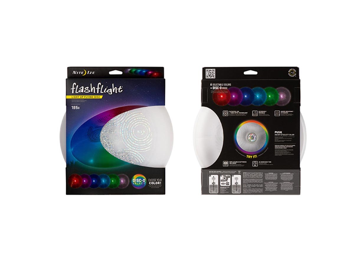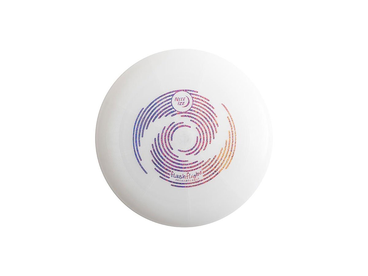 This professionally-designed Nite Ize Flashflight Flying Disc is one of the best on the market! The ever-popular Flashflight design now offers Disc-O Select, allowing you to choose from one of four selectable colors or leave it in color-changing Disc-O mode for hours of nighttime fun. Constructed of lightweight, durable materials, with perfect balance for a long, straight flight. Weighing only 185 grams, the Flashflight looks, feels, and flies like the highest quality non-illuminated discs, making it a perfect day-time disc that shines at night.