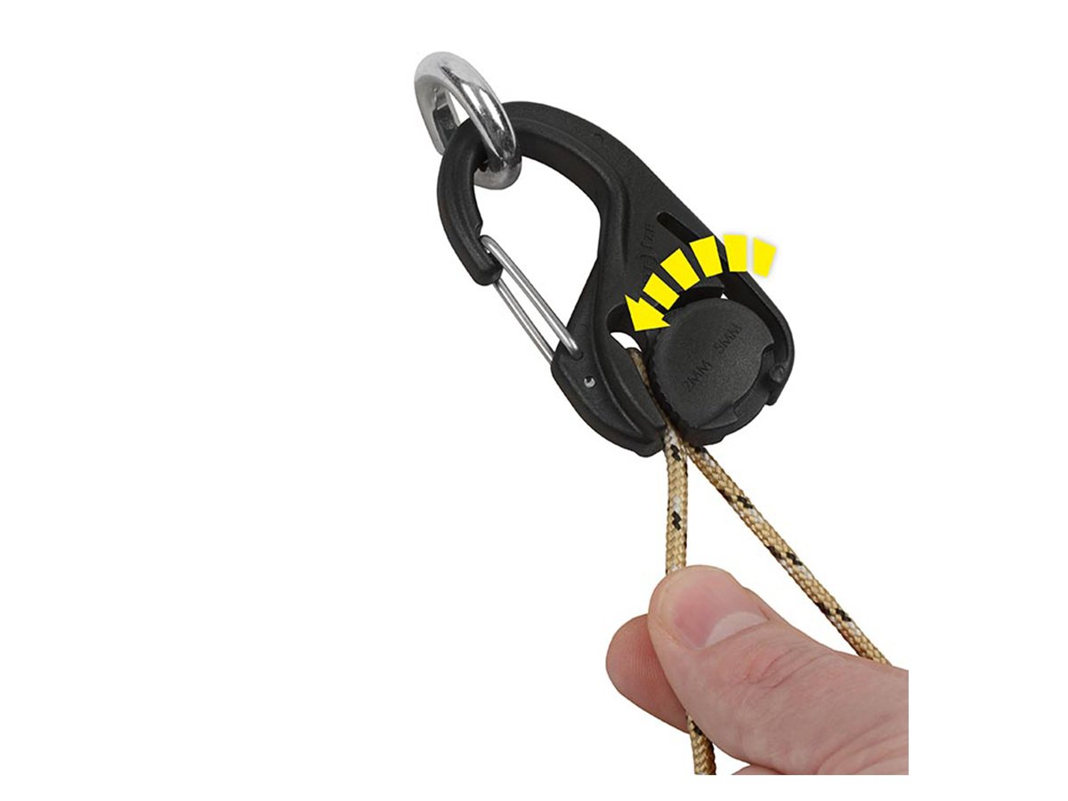 - Tighten, tie off and hold tension to ropes and cords without knots