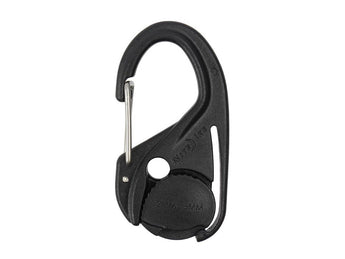 - Strong plastic carabiner with stainless steel gate and locking cam mechanism