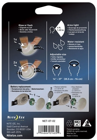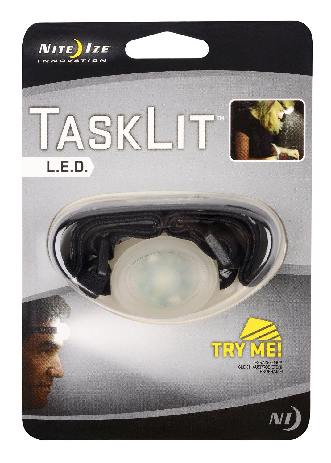 NiteIze TaskLit LED Headlamp - NET-07-02The Nite Ize TaskLit is the perfect hands-free nighttime lighting device. Its parabolic L.E.D. lens illuminates a four-foot area with a full flood beam that's gentle on night vision; yours and everyone else's. Made with a high-quality elastic headband that adjusts easily to fit any head size, it weighs only .8 ounces, so it's easy to carry and comfortable to wear. Push the water-resistant lamp once for steady glow mode (for reading, working, and navigating in the dark), twice for continuous flash (for running, cycling, or any time you want to alert others of your presence). Our TaskLit comes with long-life replaceable batteries and comes with a white led.