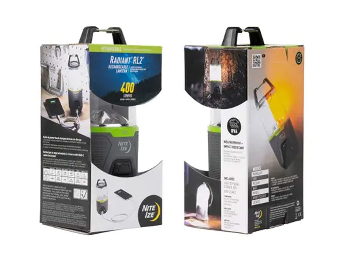 The Nite Ize Radiant RL2 is a lantern that emits up to 400 lumens, powered by a reliable lithium-ion battery pack that supplies a 4-day runtime on moonlight mode. Create soft, diffused light with the RL2, either directly via the lamp or inside the included storage bag, which will glow with the lantern inside.