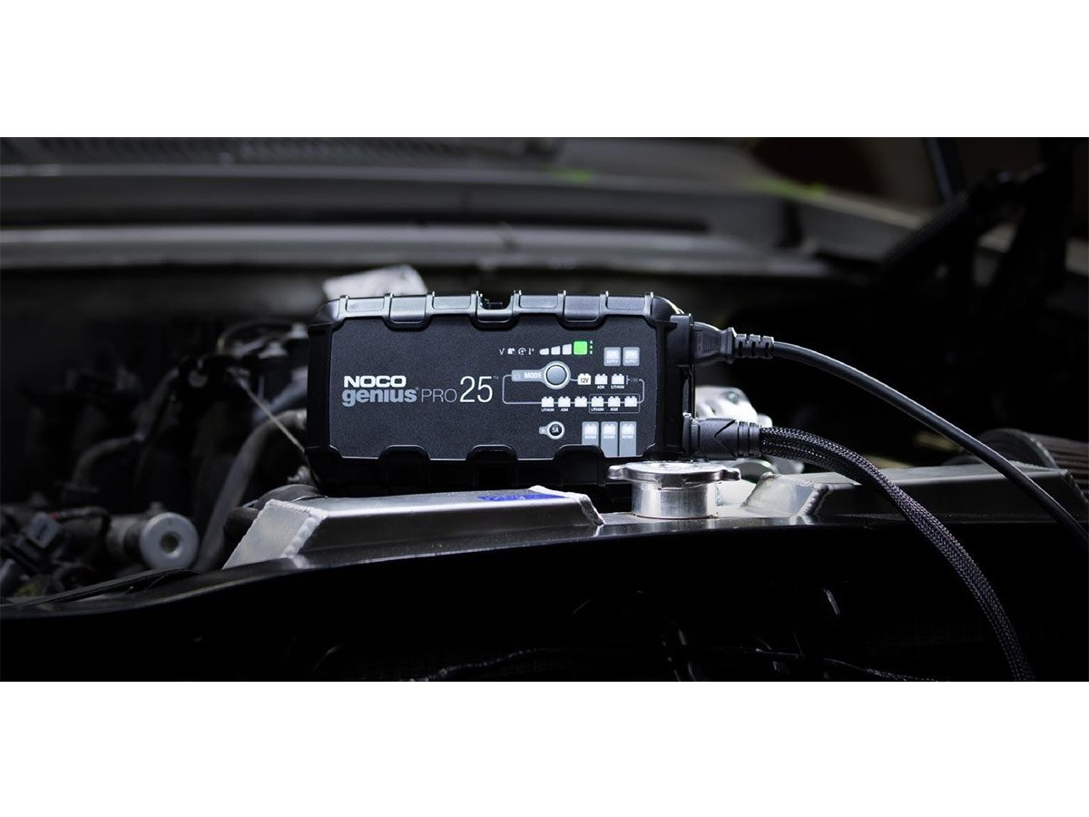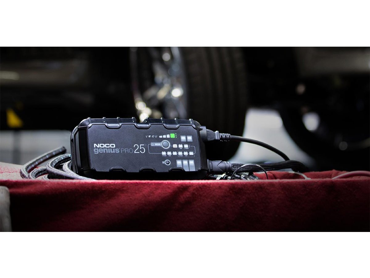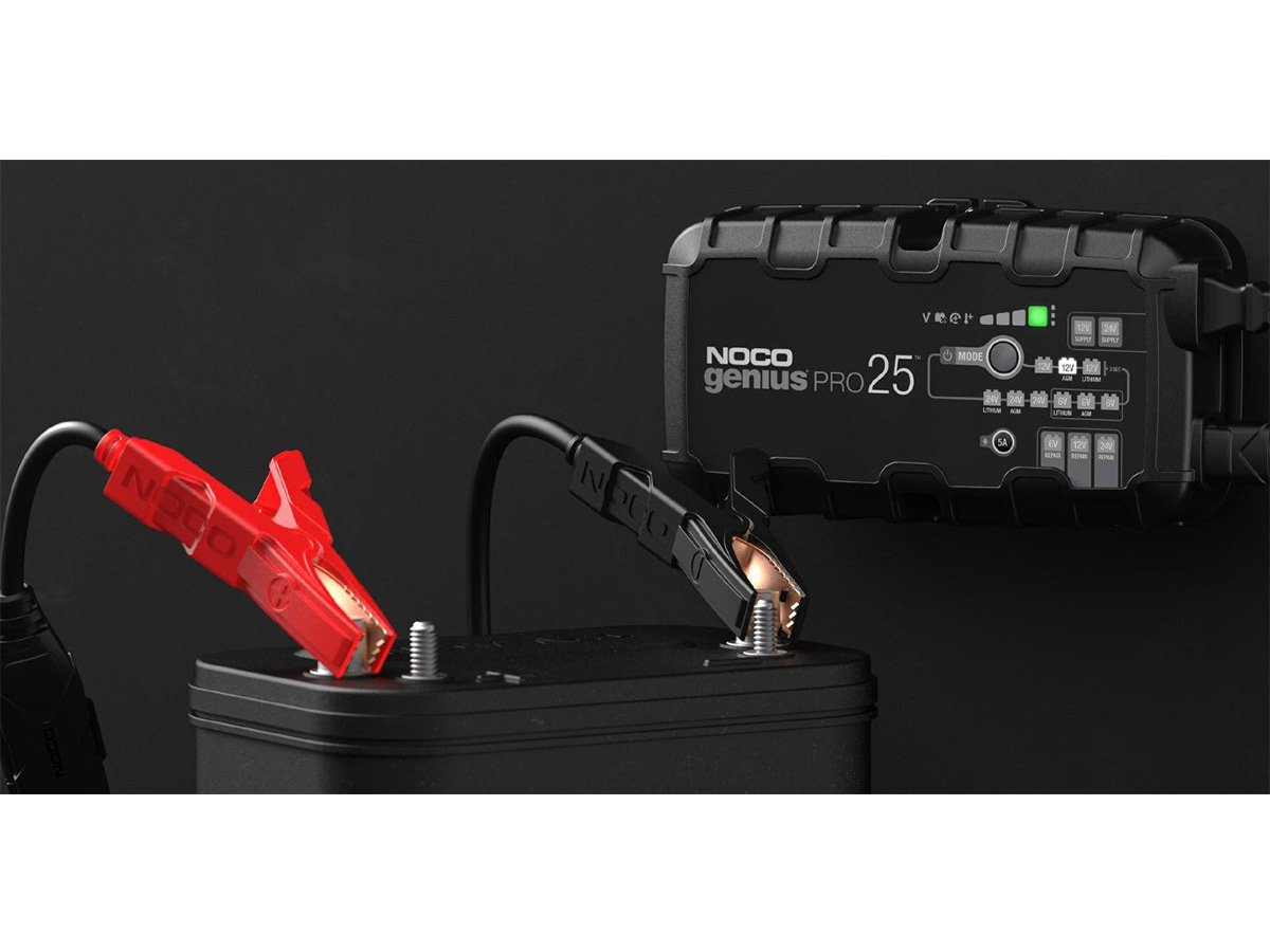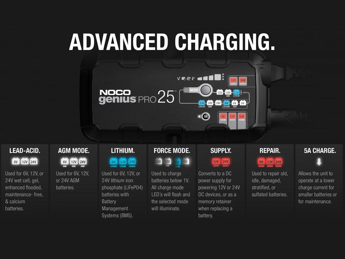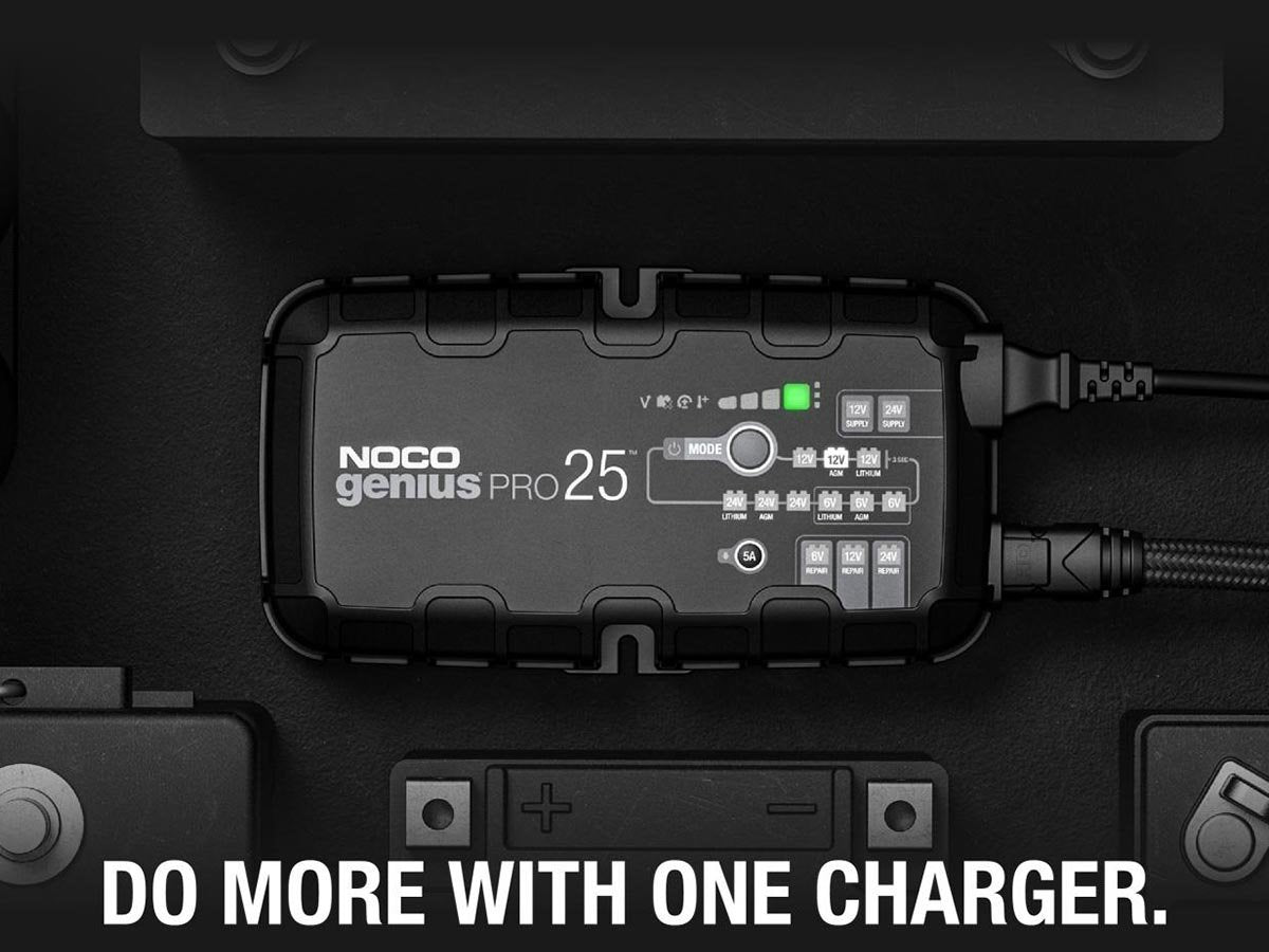 The NOCO GENIUSPRO25 is a multi-functional powerhouse for charging batteries. Able to charge with 6, 12, or 24 Volts, charge lead-acid automotive, marine, and deep-cycle batteries. Recharging with 25 amps, push the limits of what's possible for compatible flooded, gel, AGM, and Lithium-Ion batteries. With high amps, multiple Voltage charging, and several compatible battery types, this is one versatile charger fit for daily or industrial use.