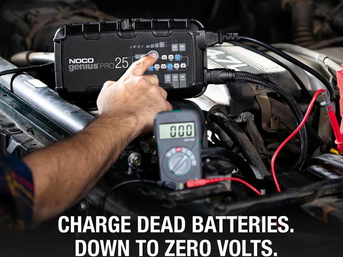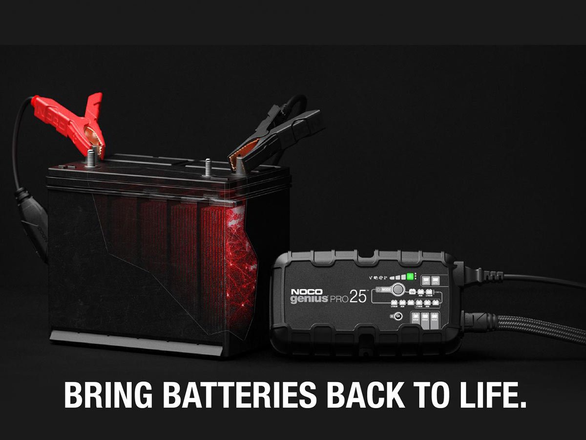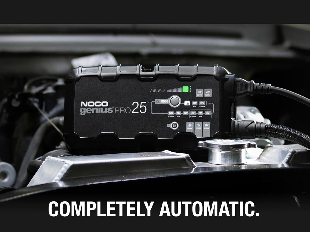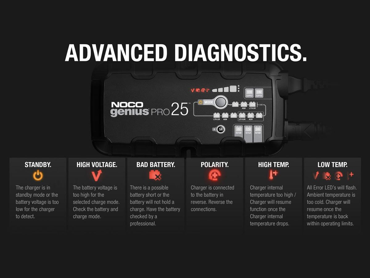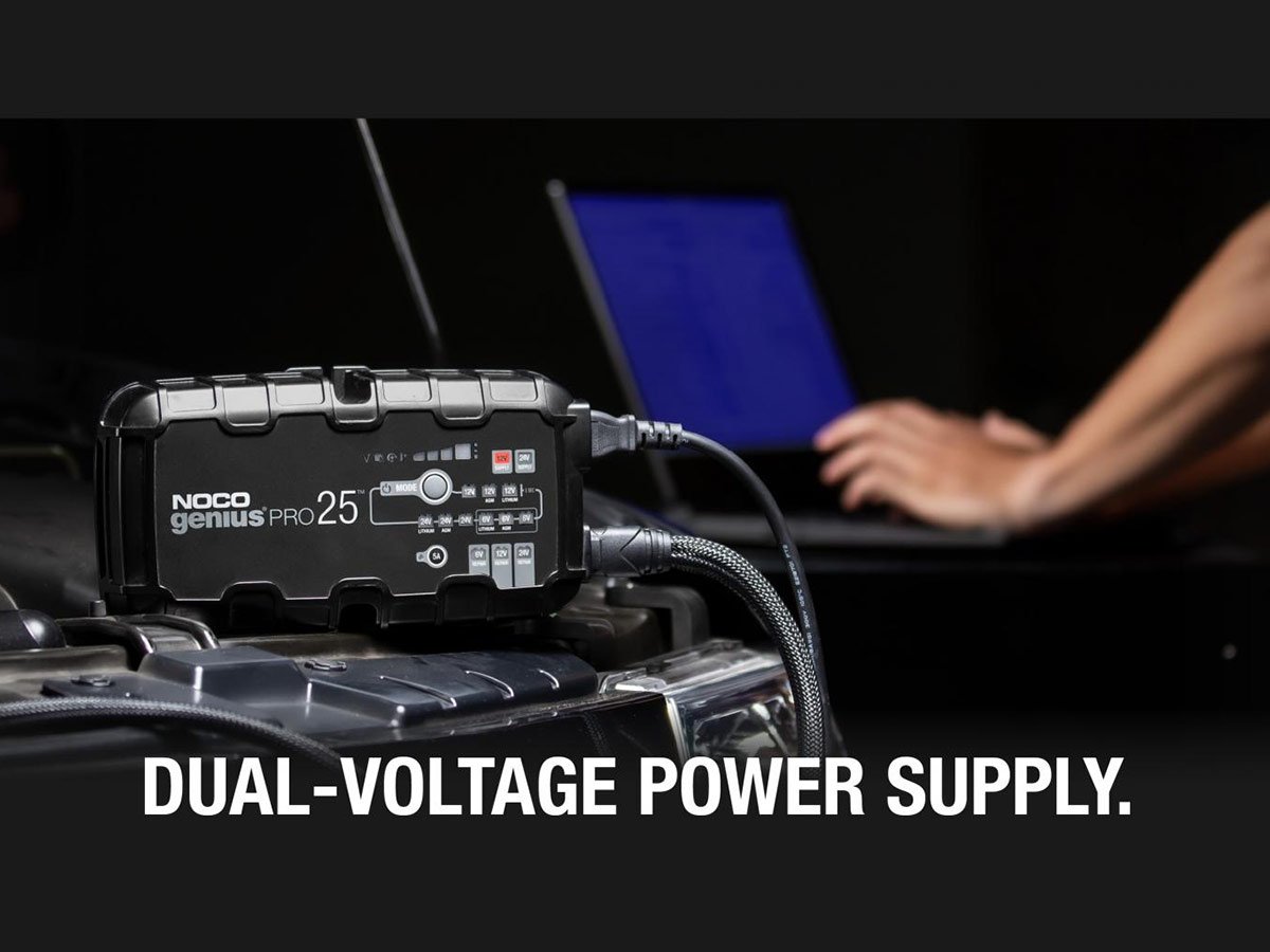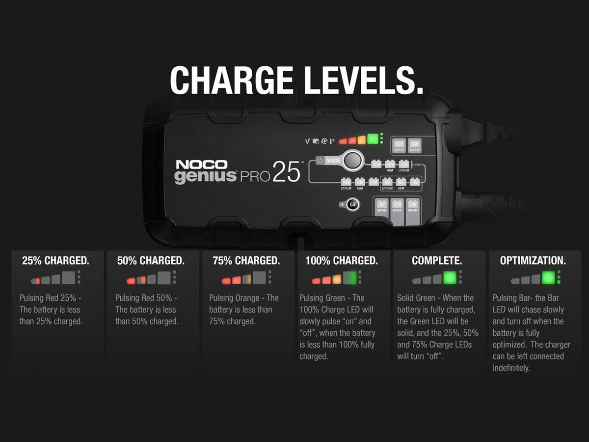 The NOCO GENIUSPRO25 is a multi-functional powerhouse for charging batteries. Able to charge with 6, 12, or 24 Volts, charge lead-acid automotive, marine, and deep-cycle batteries. Recharging with 25 amps, push the limits of what's possible for compatible flooded, gel, AGM, and Lithium-Ion batteries. With high amps, multiple Voltage charging, and several compatible battery types, this is one versatile charger fit for daily or industrial use.