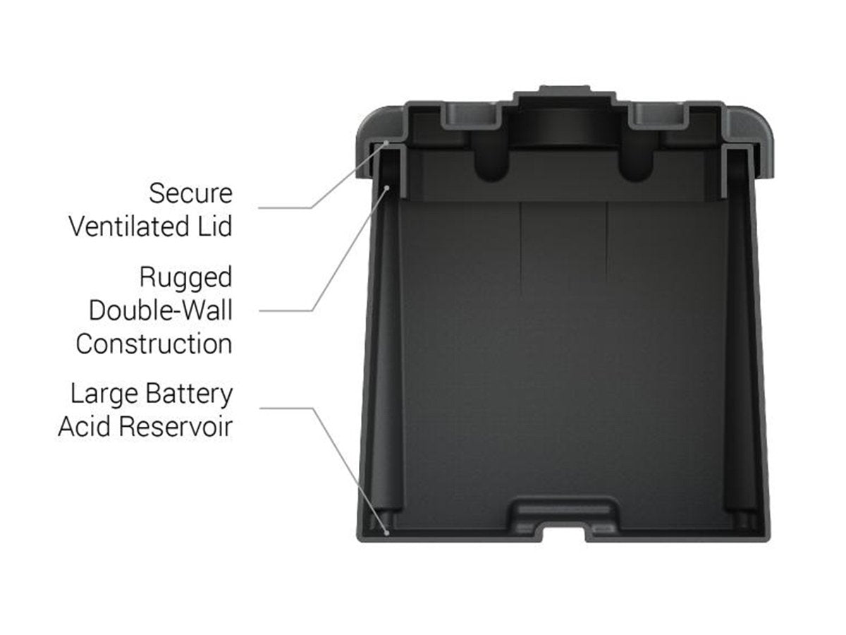 Constructed tough and rotationally molded, the HM408 protects 4D batteries from a host of contaminants. It keeps batteries stable and unharmed against low temperatures, UV, oil, and gas. It maintains impact resistance properties in conditions down to -20℉ and has UV inhibitors and color stabilizers that prevent structural damage and color fading. Withstand the great outdoors with this dependable battery box.