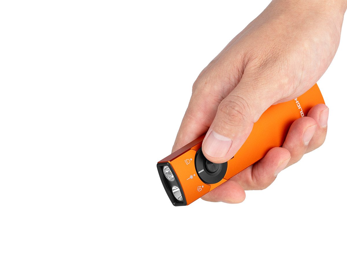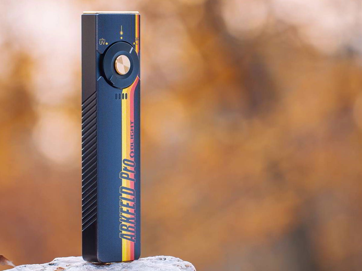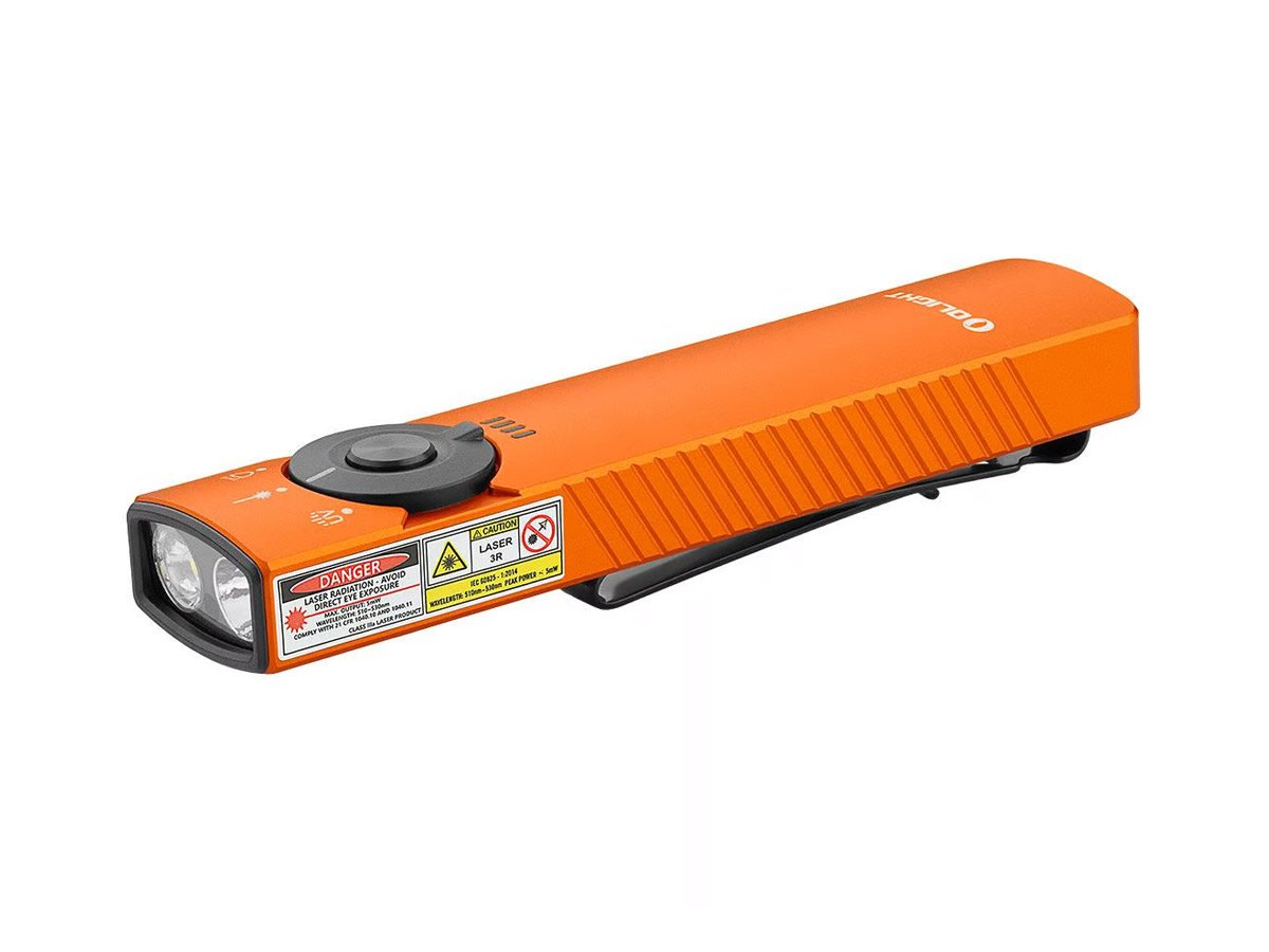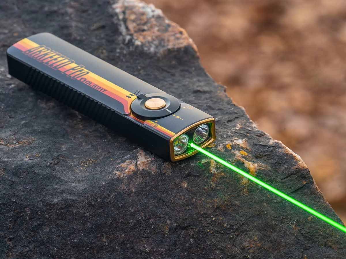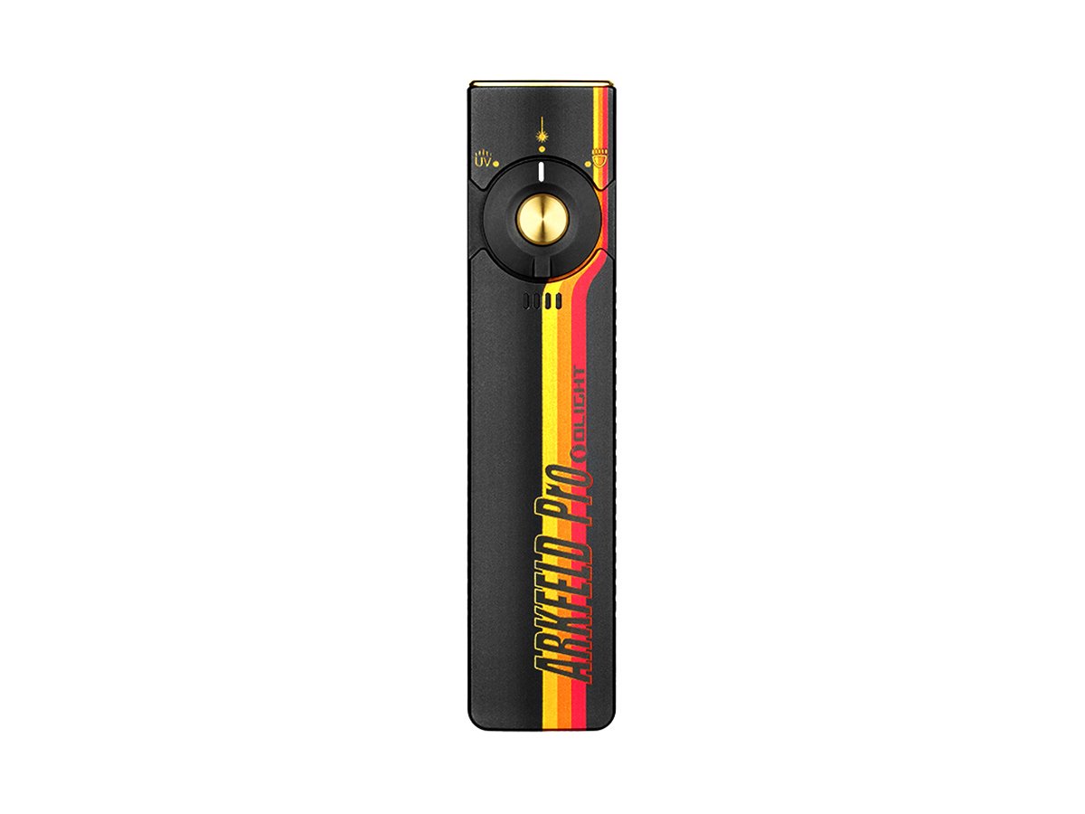 You read that right - Olight's Arkfeld Pro has triple the lighting possibilities all in one flashlight. Access a cool or neutral white light, a green laser beam, and a UV light with the easy-to-use central dial.