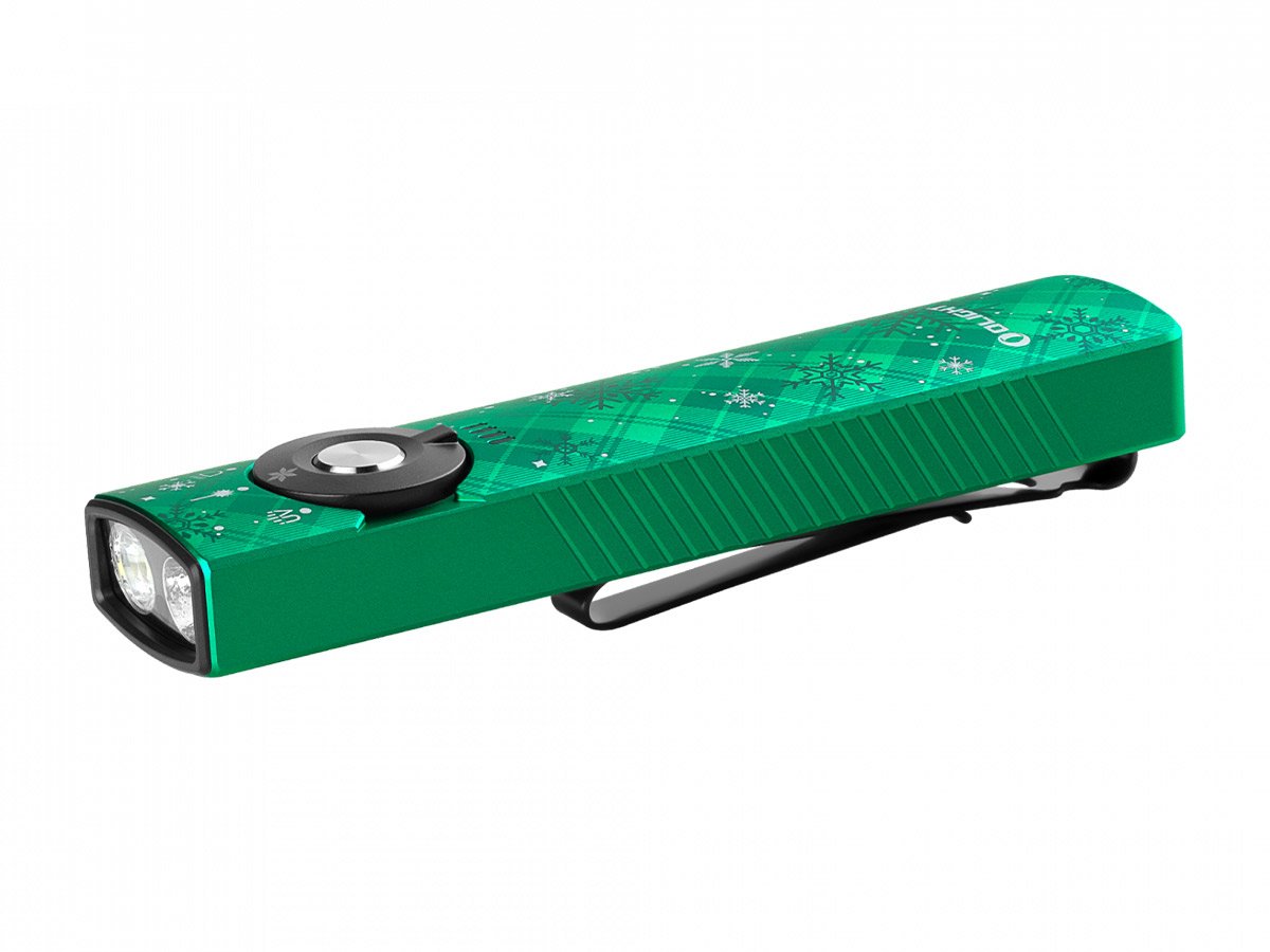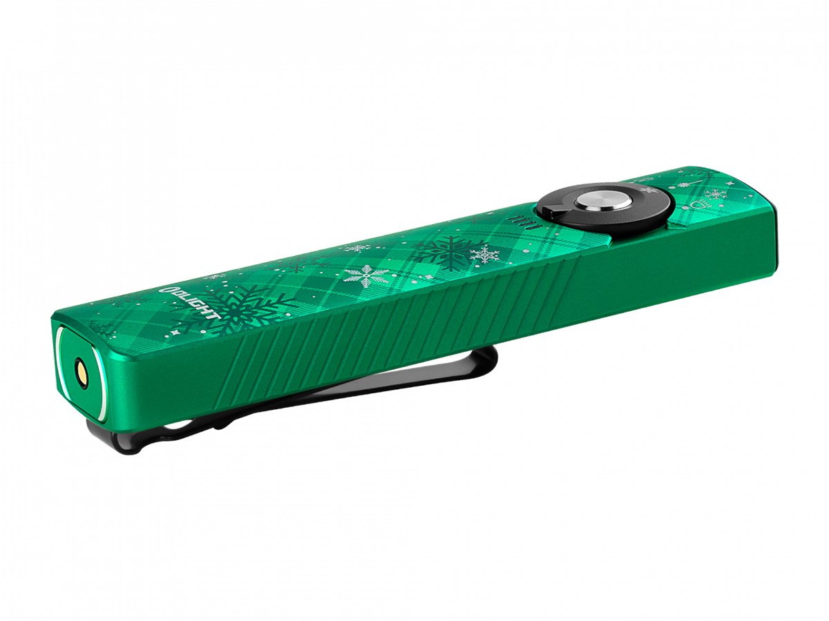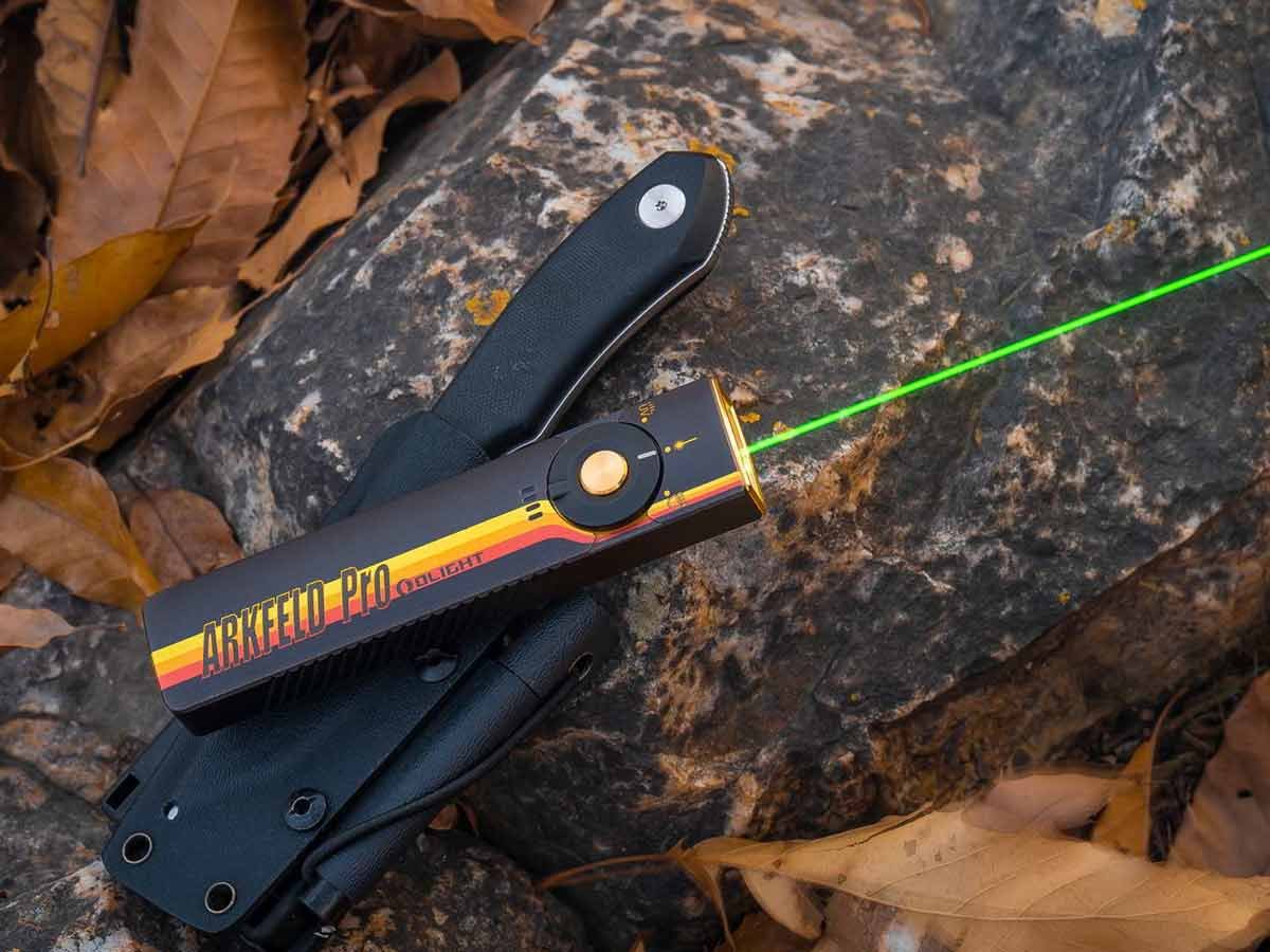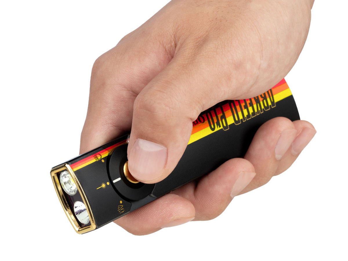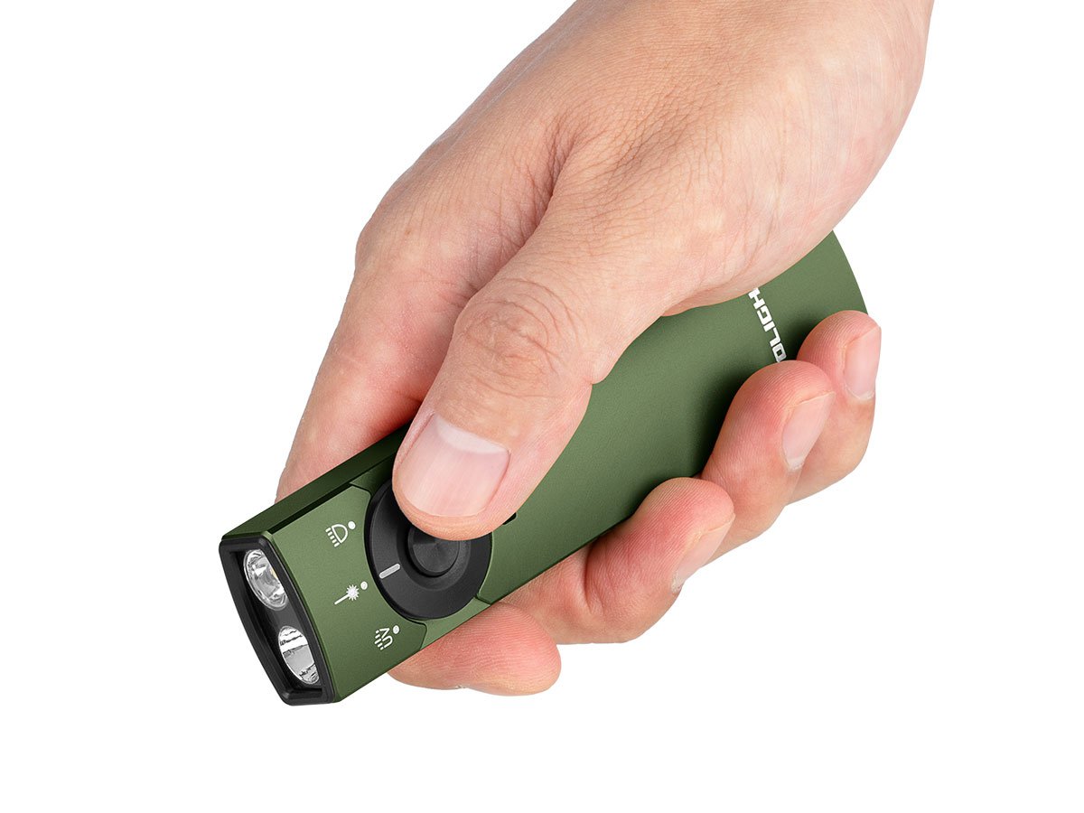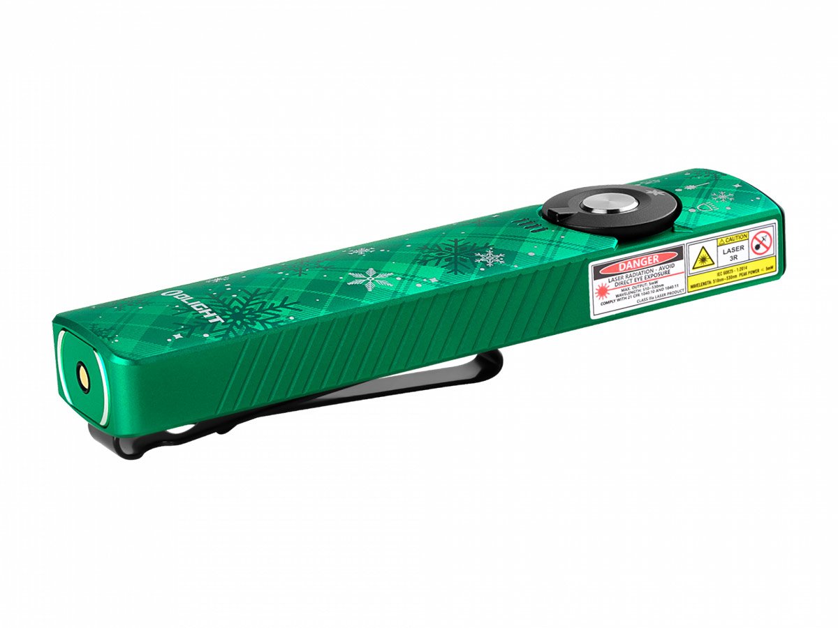 You read that right - Olight's Arkfeld Pro has triple the lighting possibilities all in one flashlight. Access a cool or neutral white light, a green laser beam, and a UV light with the easy-to-use central dial.