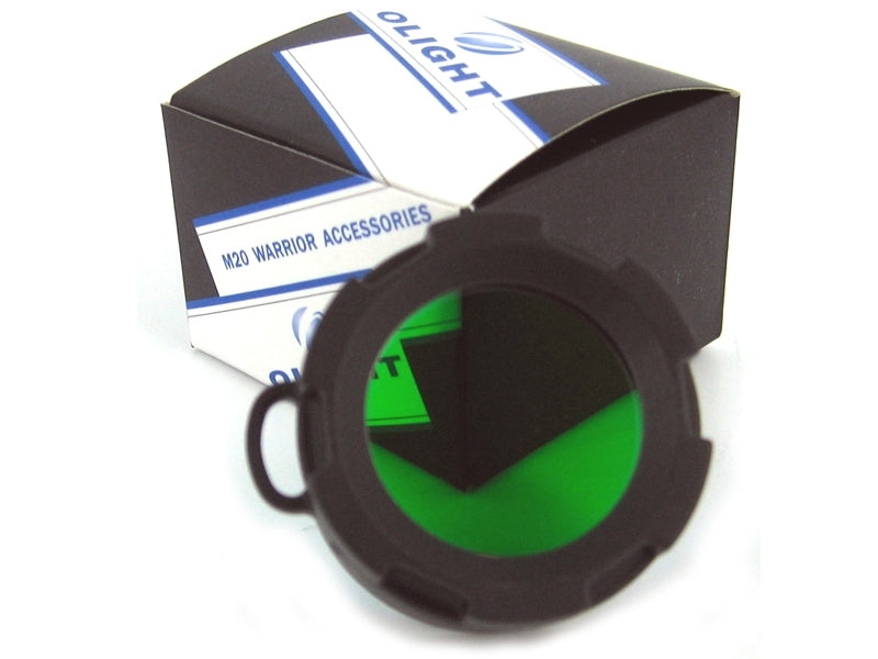 Olight Filter and Diffuser Fit Olight M20 Series Lights as well as many other similar sized lights.Green light is preferred by hunters and fishermen because it is a very soft light that will not spook their prey. Green also does not attract insects like white or yellow light does. It is not easily picked up, unless looking directly at it, so it is useful in covert operations. It is also useful in smoke or fog filled environments. Green is also very popular for night time map reading. Features:
