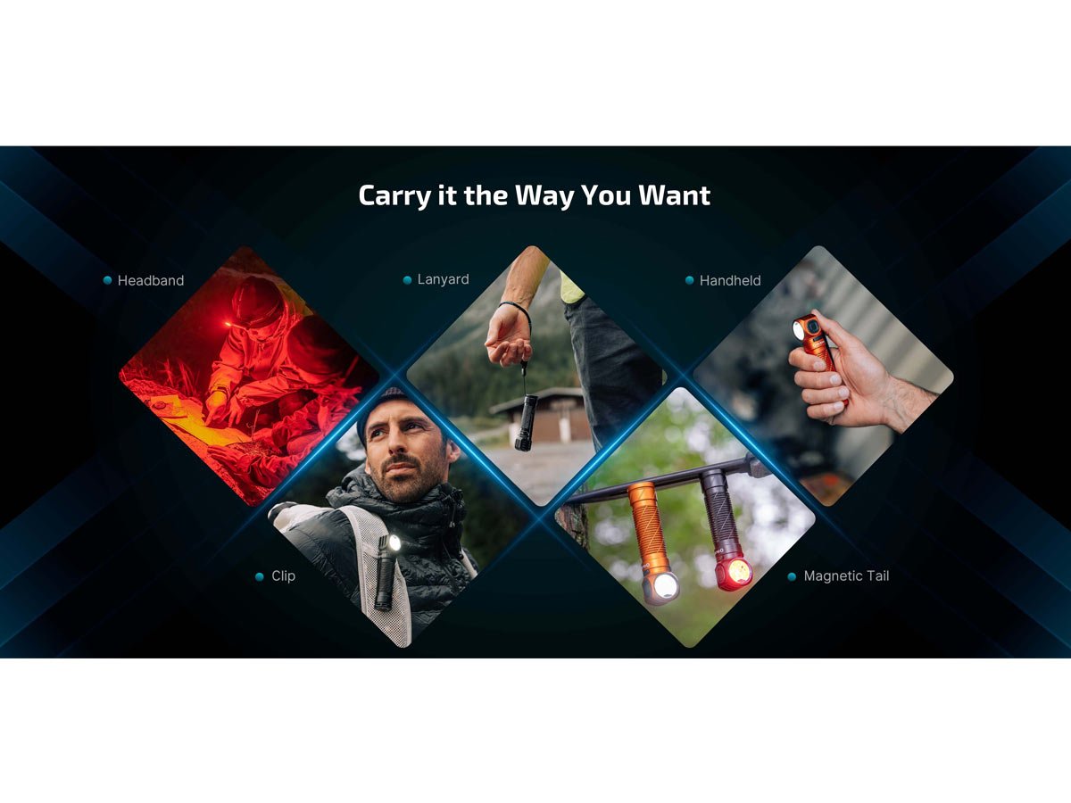 - Multiple mounting options for use as a headlamp, EDC flashlight, right angle light, and overhead light