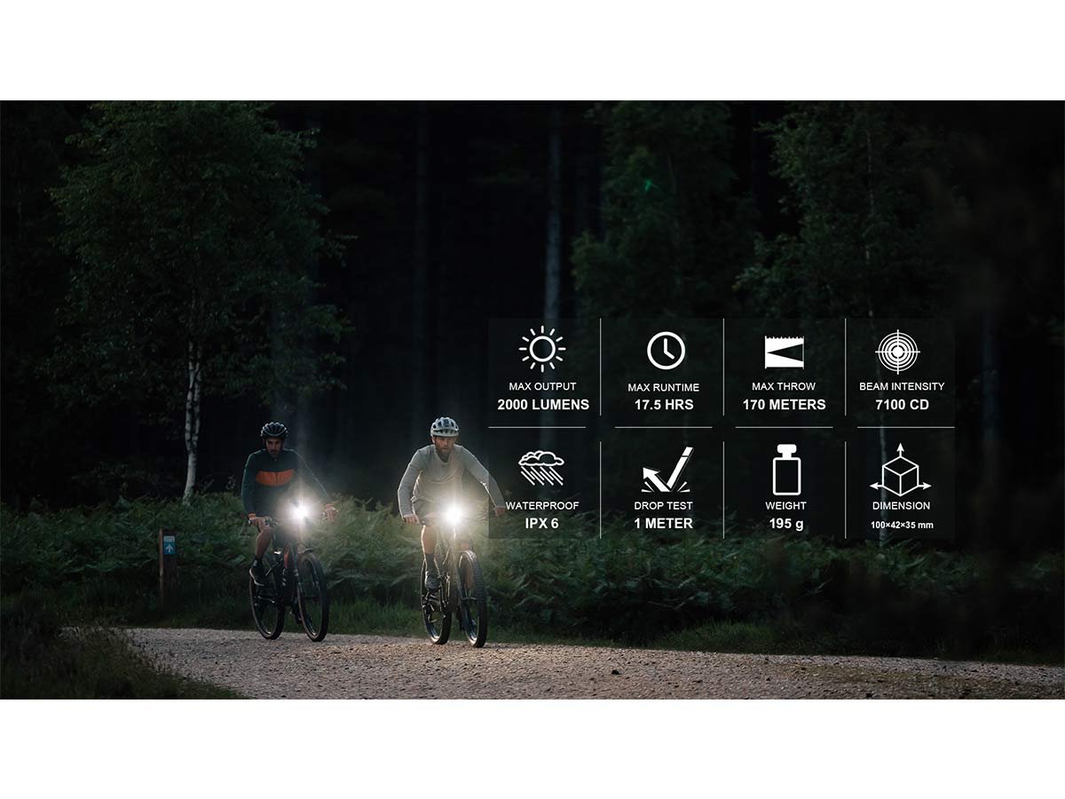 For biking enthusiasts who don't want to stop just because it's nighttime, use the Olight RN-2000! With a maximum output of 2000 lumens in a 170-meter beam, this light is the perfect tool for illuminating mountain trails and urban commutes. With its hybrid beam type mode, you can maximize visibility for long distance spotting and close-range viewing.
