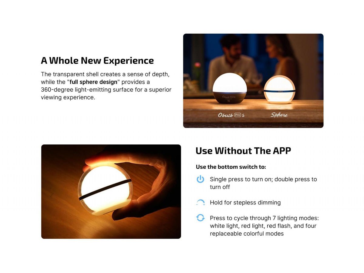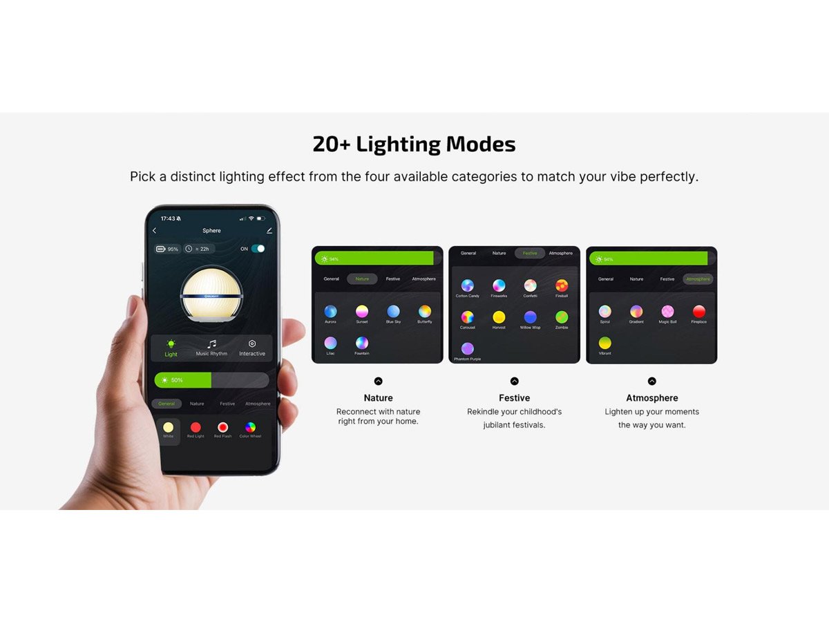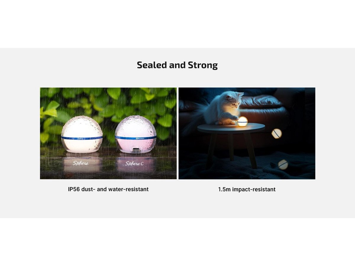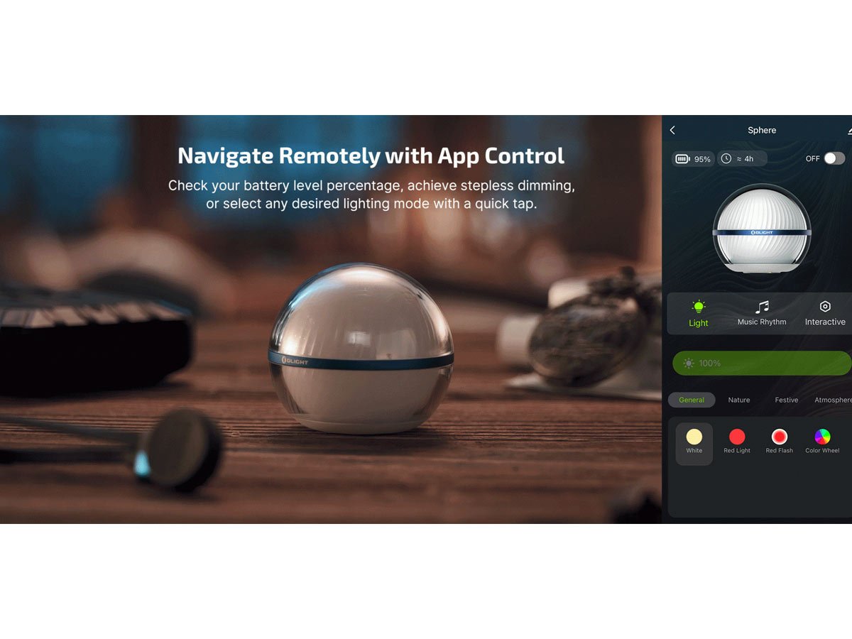 The Sphere C was built with Bluetooth wireless connectivity, allowing you to link it to any smart device with the Olight app. For those who prefer classic control by hand, you can manually control the light quality with 7 outputs and stepless dimming. When paired via the app, there are over 20 intuitive light settings available, including aesthetic themes, music rhythm syncing, and a handy countdown timer mode! The app also enables group control with up to 100 other lights and real-time battery status monitoring.