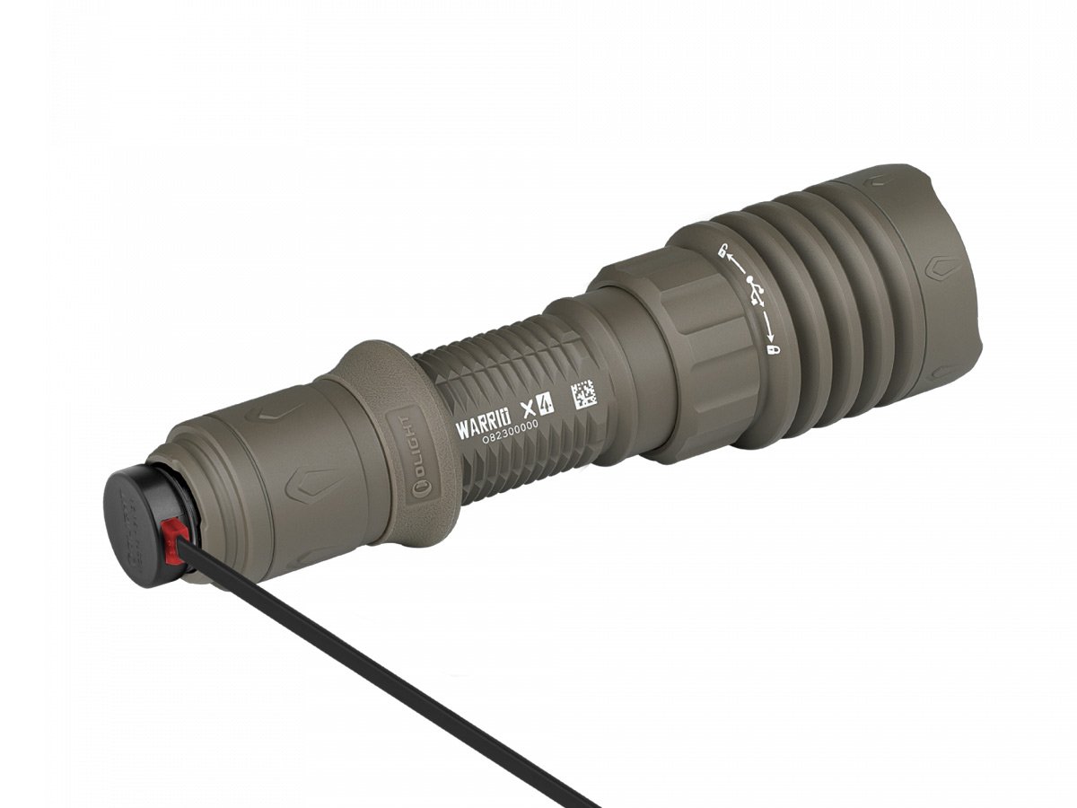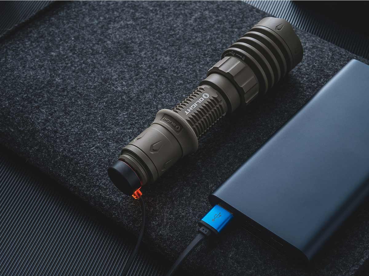 The Warrior X 4 is powered by an included lithium-ion 21700 battery that is rechargeable via the tail switch with the MCC3 magnetic cable or using the flashlight's USB-C port. This allows you to keep the light charged in diverse circumstances by plugging in to a computer or power bank USB output wherever you are.