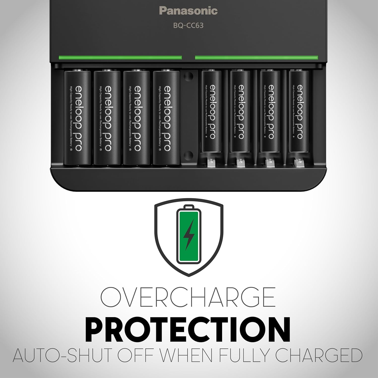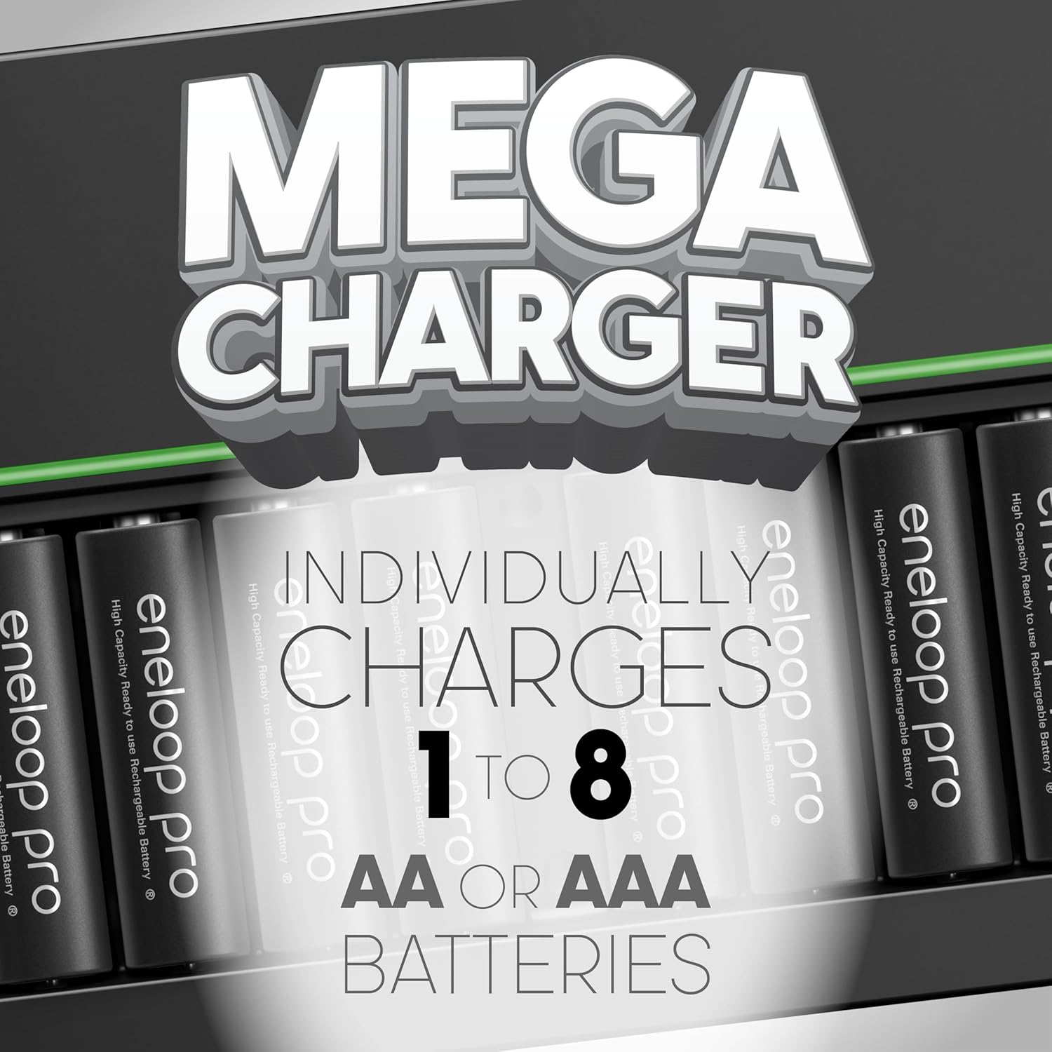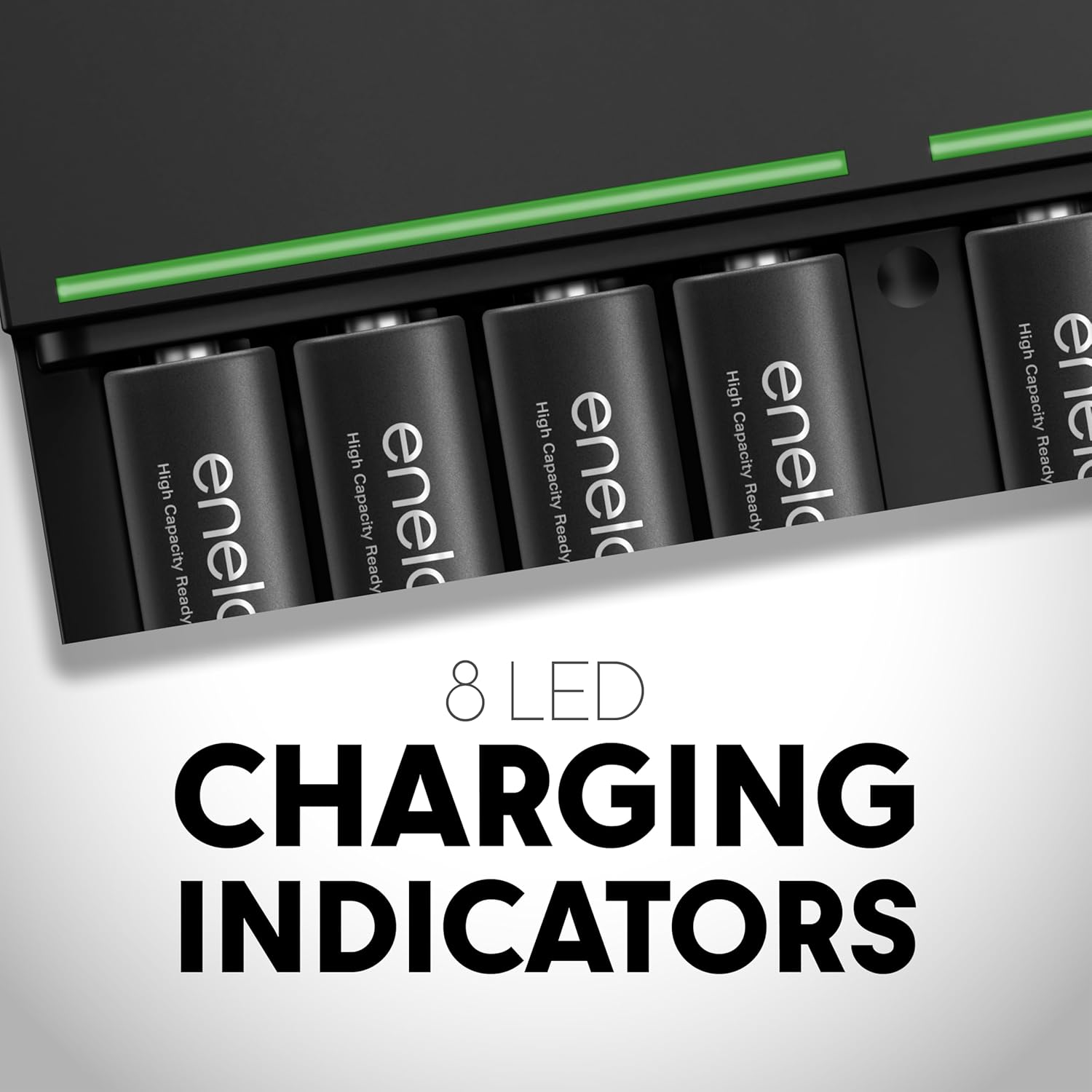 - 8-bay charger optimized for Eneloop Pro AA and AAA batteries