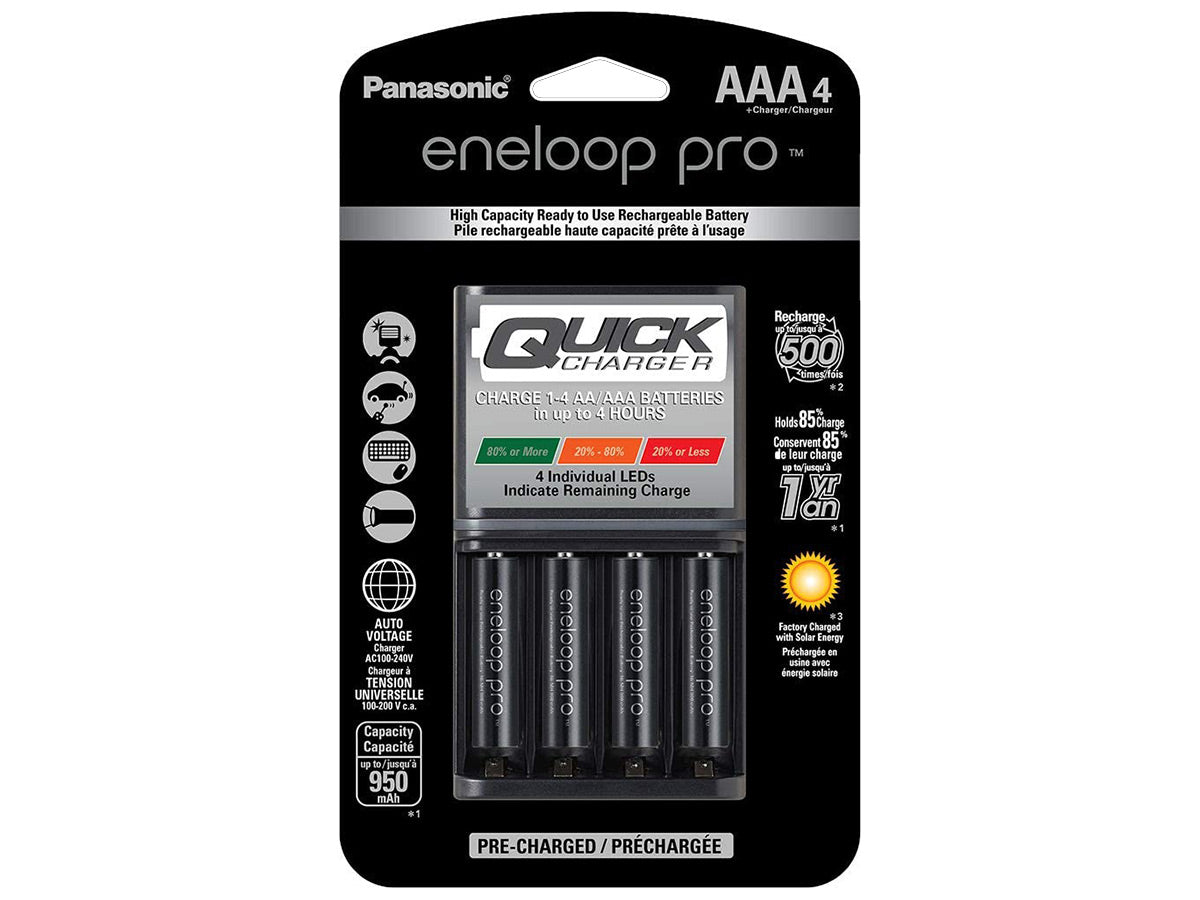 - Includes 4 pre-charged Eneloop NiMH AAA batteries