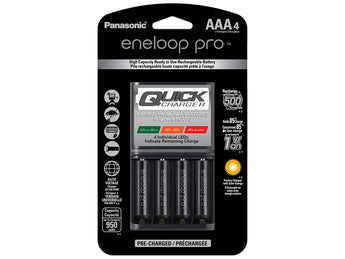Keep your essential Eneloop NiMH AA and AAA batteries charged up and ready to go with this Panasonic Eneloop Pro Quick Charger. This smart charger allows you to charge a combination of AAA and AA NiMH batteries at once, even if installed at different times. The 4 channels operate independently of each other, and have battery sensing safety technology so you will never over-charge one battery while others are still charging. The bright LED indicator lights ensure that you can see the progress of charging, each battery status, and even how much remaining power you have left. Its retractable AC plug makes it convenient for storage and travel so you can have power where you need it most. The included Panasonic Eneloop AAA batteries have a high capacity of 950mAh and are pre-charged so they are ready to use right out of the package.