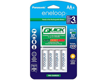 The Panasonic 4-position Quick Charger is the best way to power up and rapidly recharge your everyday electronics. This charger comes equipped with 4 bays and is capable of charging at any standard AC power outlet. Included with this variation of the charger are 4 Eneloop AA batteries, one of the world's most popular batteries for home and business electronics.