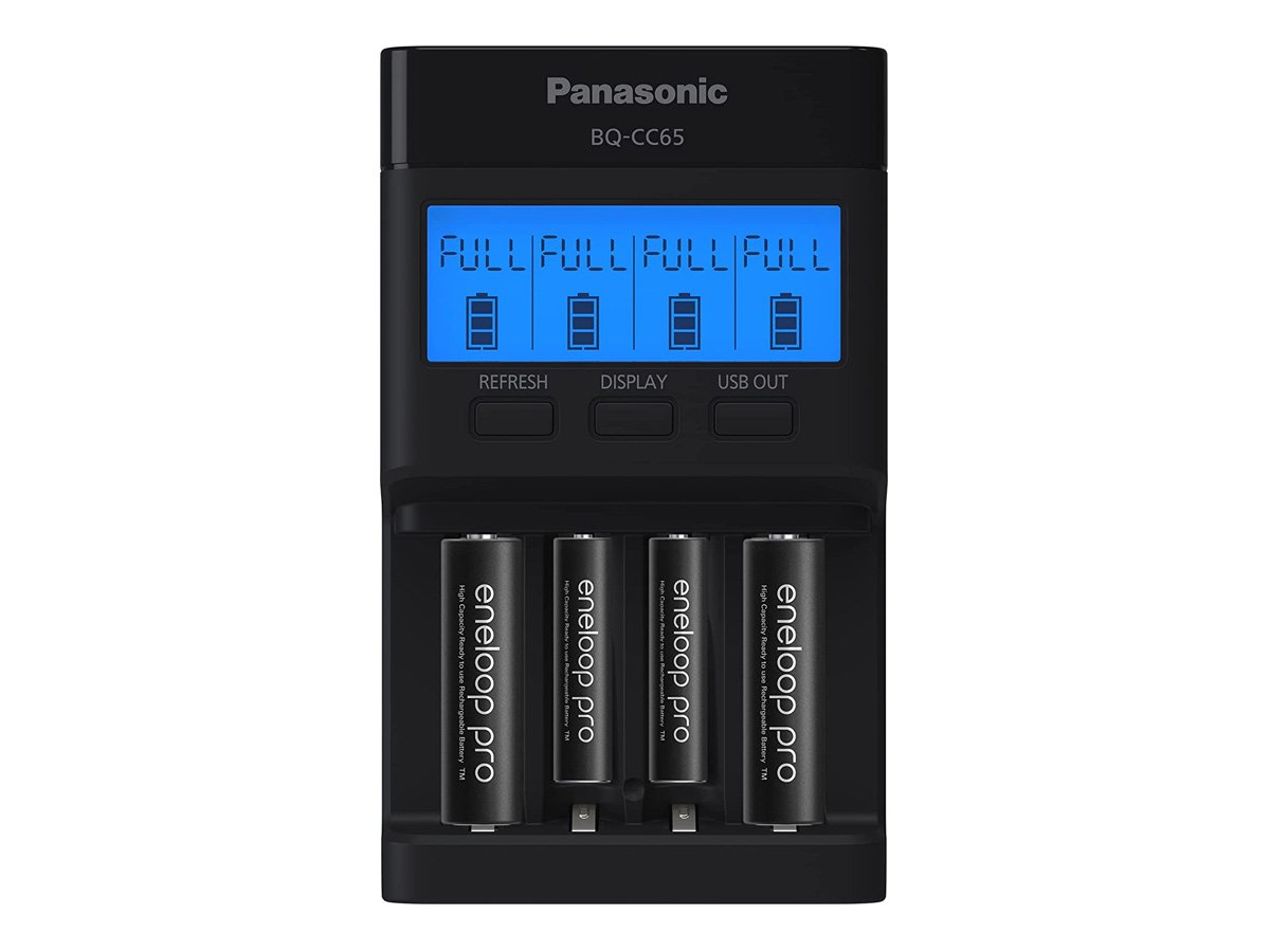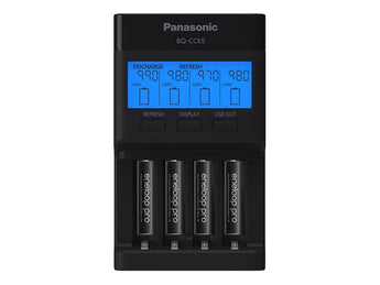 The Panasonic Eneloop CC65 is a battery charger with the ability to channel battery power to your other devices on demand. The CC65 has an easy-to-read 3" x 1" backlit LCD screen with a live graphic readout of the status of each installed battery. Information available via the Display button includes voltage (V), capacity (mAh), discharge power (Wh), and charge/discharge time. The CC65's Refresh ability employs a charge-discharge-recharge technique to revive disused, inactive rechargeable cells.