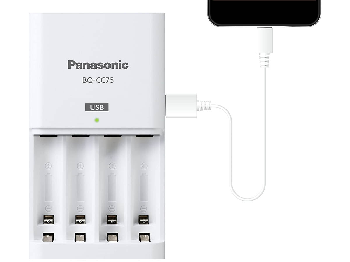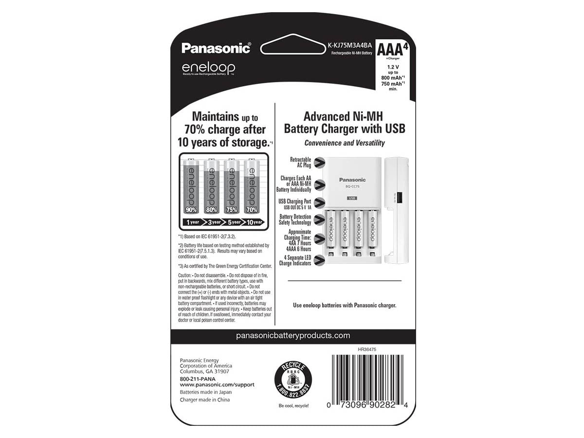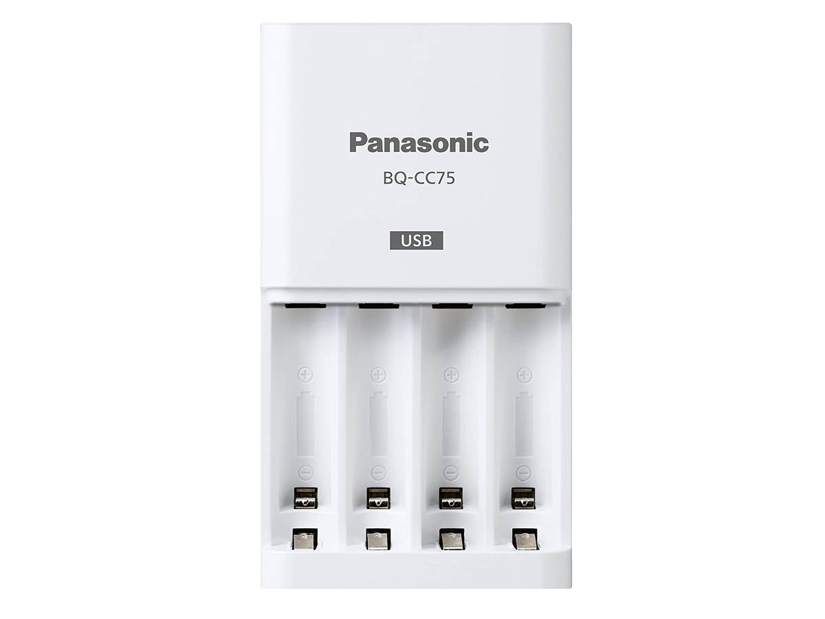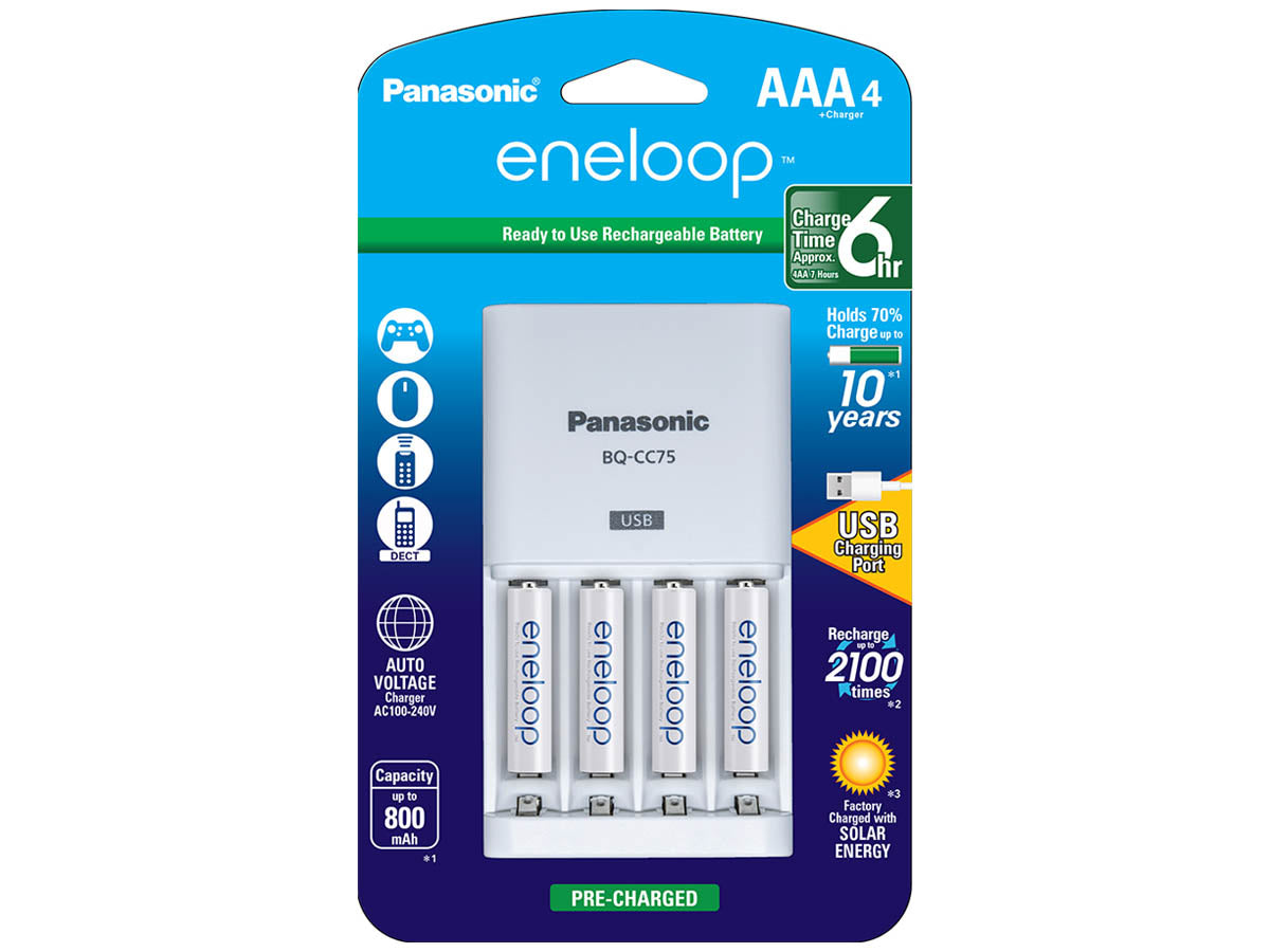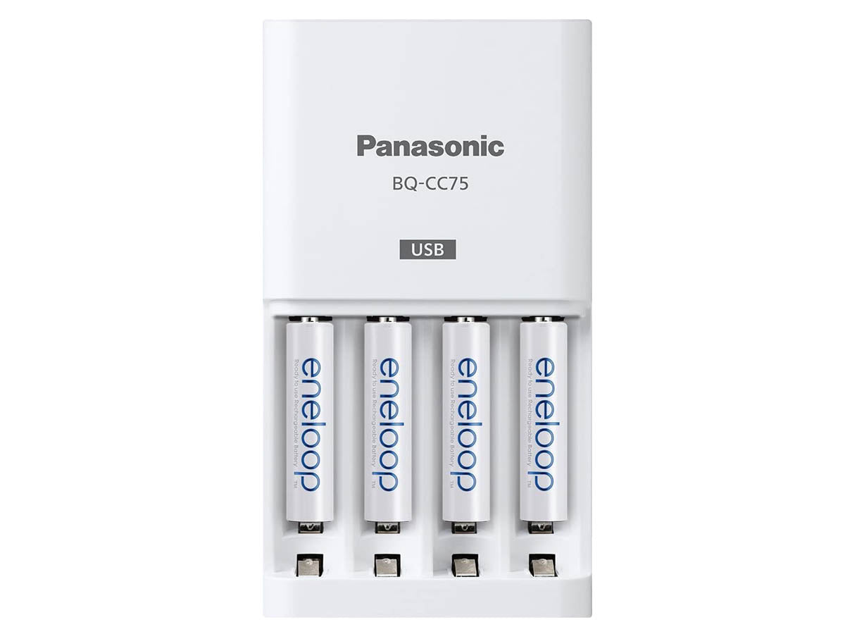The K-KJ75M3A4BA charger kit from Panasonic comes with a BQ-CC75 4-bay charger, and 4 x AAA eneloop batteries pre-charged with solar energy. Each AAA battery features a large 800mAh capacity, has 2100 charge cycles, and is rated for a 10 year shelf life. This charger is also compatible with AA NiMH rechargeable batteries, and can charge any combination of AA/AAA cells at once.