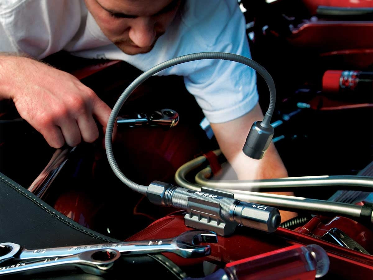 A working man is only as good as his tools, and you won't be the best until you pick up the Pelican 2365 Flex Neck LED work light. The Pelican 2365 flexible LED work light features 65 bright Lumens that fully illuminates any work space. Featuring a magnetic base, this work light can provide you secure lighting when you are tinkering with your car, plane, or any other area that has a metal surface. It is extremely stable and provides you with 7 continuous hours of light.