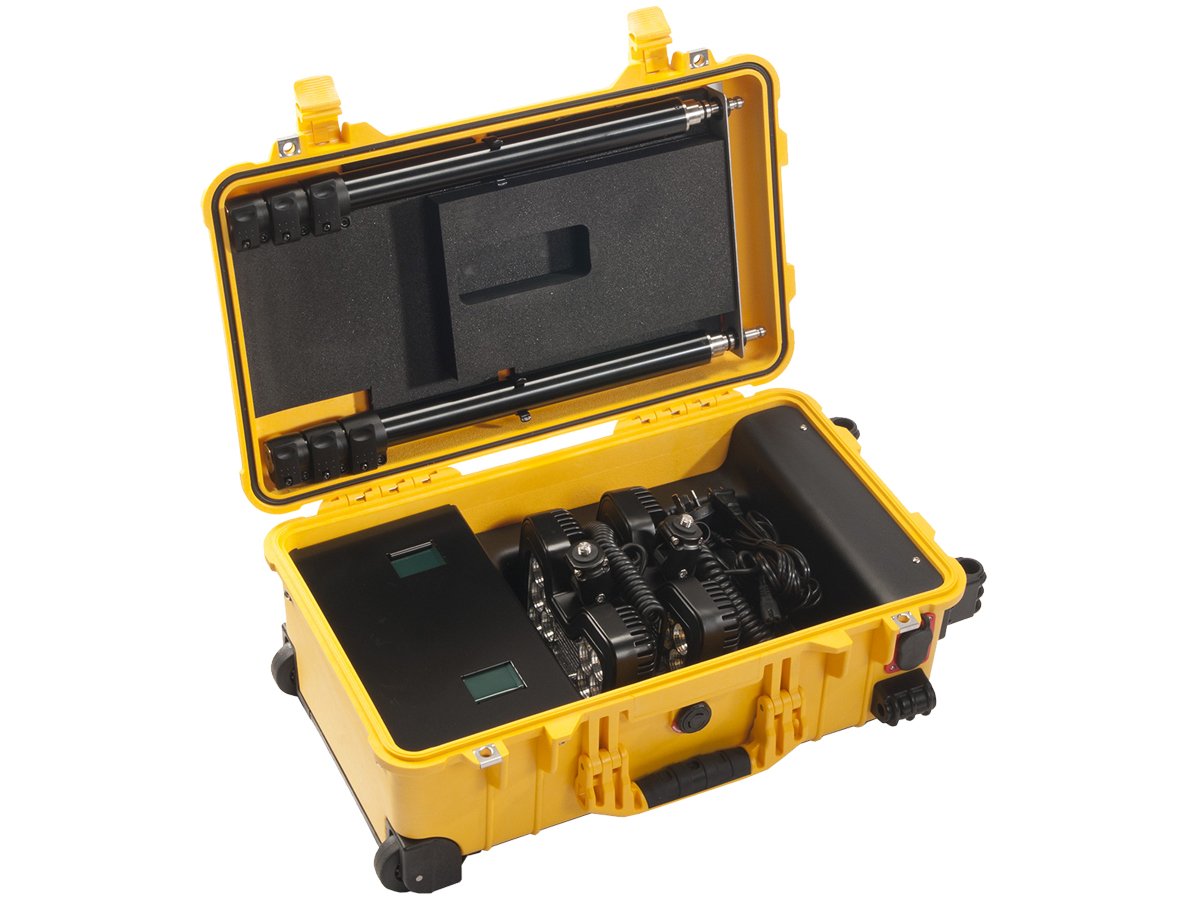 - Telescoping lamp masts extend independently to multiple heights and angles