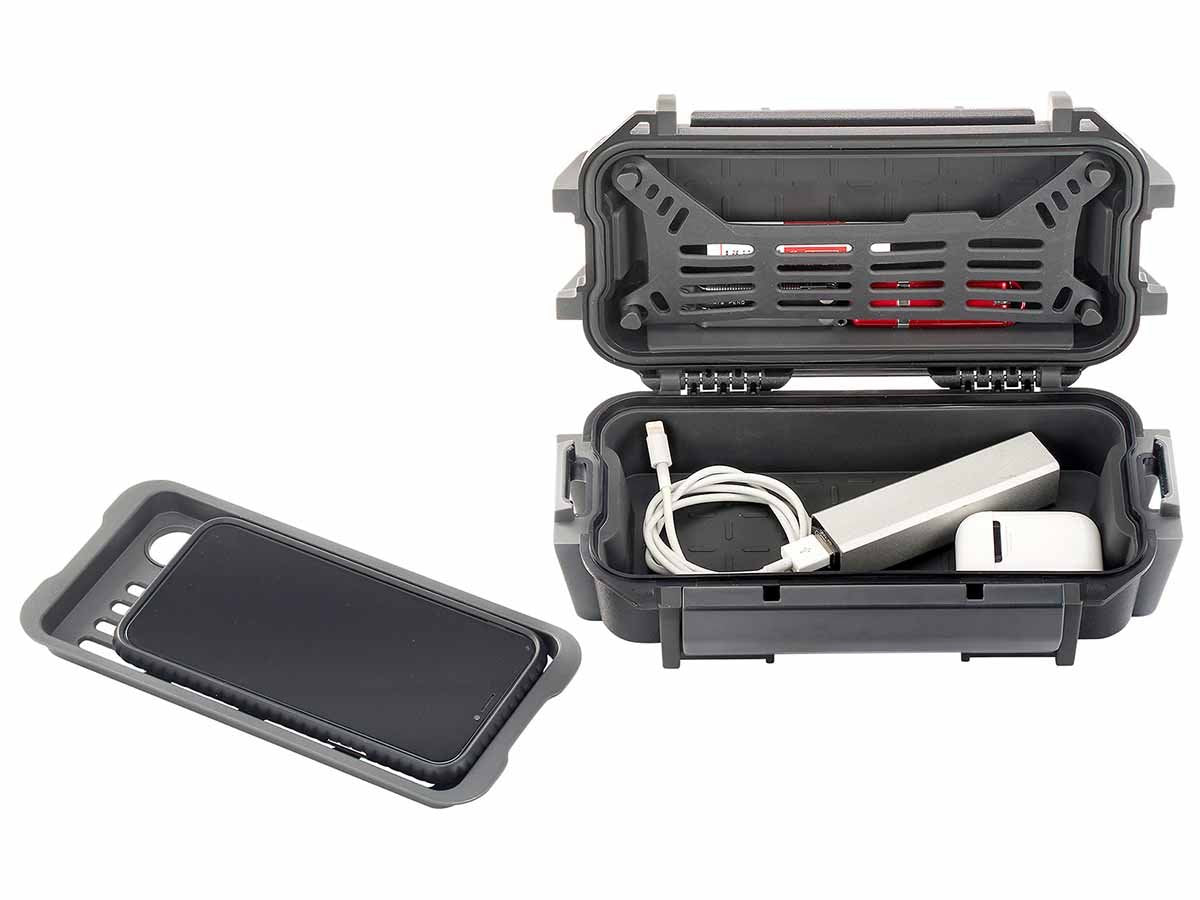 Sometimes storing your devices in a regular bag just doesn't cut it; the Pelican R20 Ruck Case has you covered. With an interior storage space of 7.1" x 3.4" x 2", this case is perfect for holding phones, chargers, and even ear buds all at once. Its rubberized protective bumpers allow the R20 to survive long falls and heavy impacts that would normally shatter your devices. For even greater protection, this case has an IP68 rating to protect your items from water, dirt, dust, snow, and everything in between. In case it's ever dropped in water, this product is waterproofed to survive being submerged 2 meters for up to 30 minutes. This feature is aided by the built in pressure valve system which keeps water out while maintaining its internal air pressure.