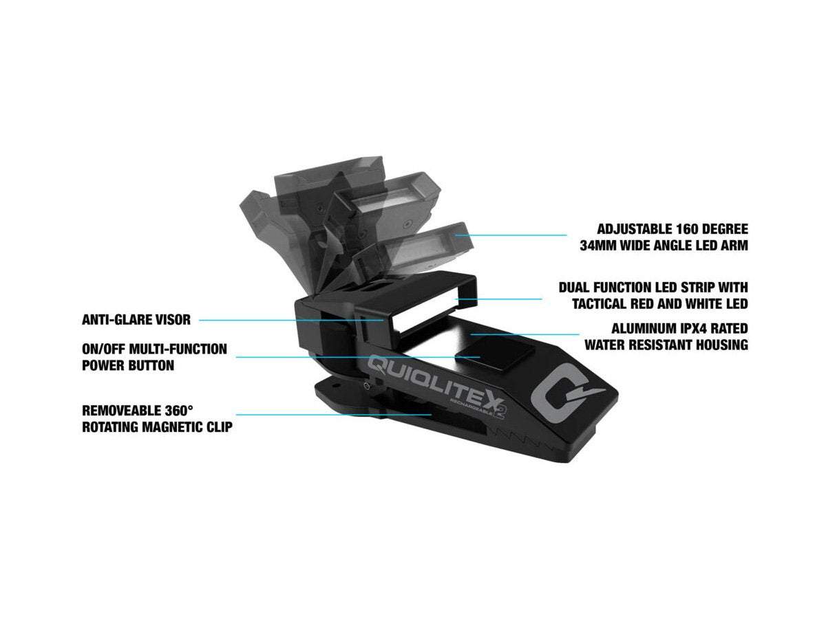 With a brightness range between 20 and 200 lumens, the QuiqLite X2 WhiteLite is your go-to for hands-free illumination on the job. The 3 brightness levels are both simple to use and versatile enough to match different environments and tasks. The X2 is also equipped with a highly visible red/white safety strobe which can be augmented by the QuiqFlare diffuser attachment to protect in emergencies.