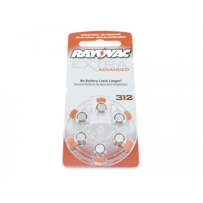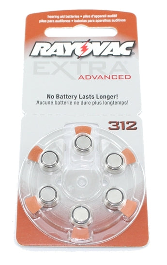 Rayovac Extra Advanced 312 Hearing Aid Zinc Air Battery - 6-PackThese dependable, long-lasting hearing aid batteries are packaged in an easy-to-use dispenser. A protective tab on each battery makes them easy to handle and is removed when the battery is used. Specifications: