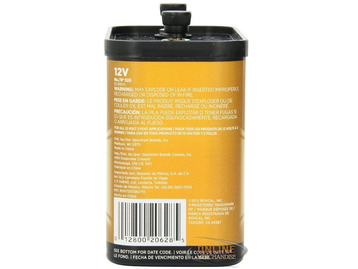 The Rayovac 12V General Purpose Lantern Battery has a reputation for its durability, long-lasting power and great value. These batteries are ideal for powering high-drain devices and built to exceed performance demands of industrial applications. It features a mercury/cadmium free formula and is guaranteed against leakage. The Rayovac 926 12V General Purpose Lantern Battery has screw terminals, is environmentally safe and meets EPA requirements for landfill disposal. Rayovac offers a complete line of Lantern batteries for long-lasting life and reliability.