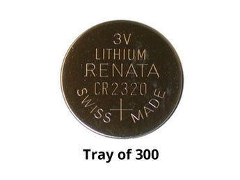 Now offering coin cells in bulk quantities for your convenience! The Renata CR2320 Coin Cell Tray of 300 provides you and your office or business with all the back up power you will need! These cells are often found in watches, calculators, cameras and other small electronics. The high 150mAh capacity allows for long run times, even through extended use and extreme temperatures. They also have a stable shelf life of up to 10 years so you can safely store them as back ups.