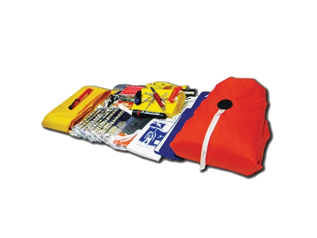 Total Kit- Food Rations, Desalting Kit, Canopy, Utility Knife, Flashlight, AA Batteries, Sponge, Rescue Whistle, Signal Mirror, Signal Flare Kit, Distress Flag, Sea Dye Marker, Repair Kit, Radar-Reflective Thermal Blanket, Compass, Paddles, Fishing Kit, Survival Manual, Kit Valise