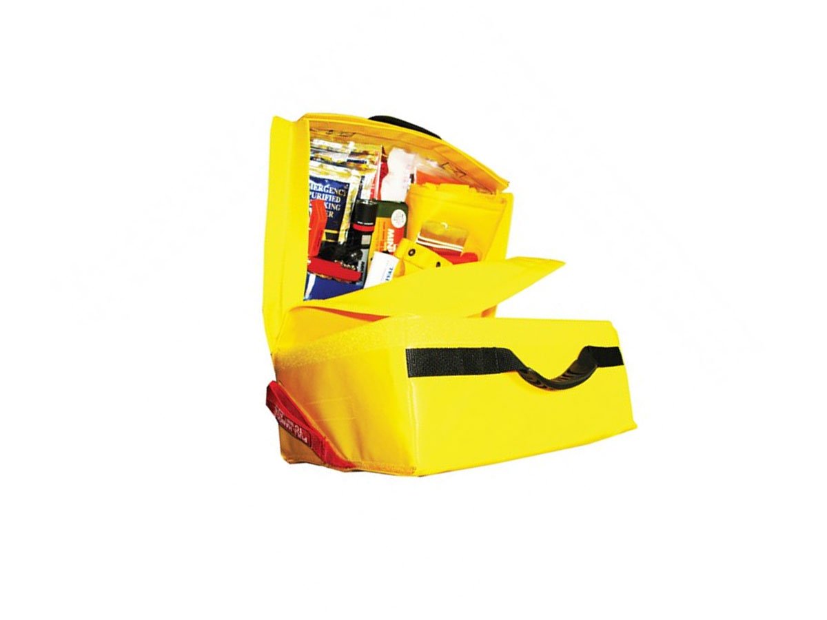 Regular Kit- Food Rations, Drinking Water, Canopy, Flashlight, AA Batteries, First Aid Kit, Rescue Whistle, Signal Mirror, Signal Flare Kit, Distress Flag, Sea Dye Marker, Repair Kit, Kit Valise