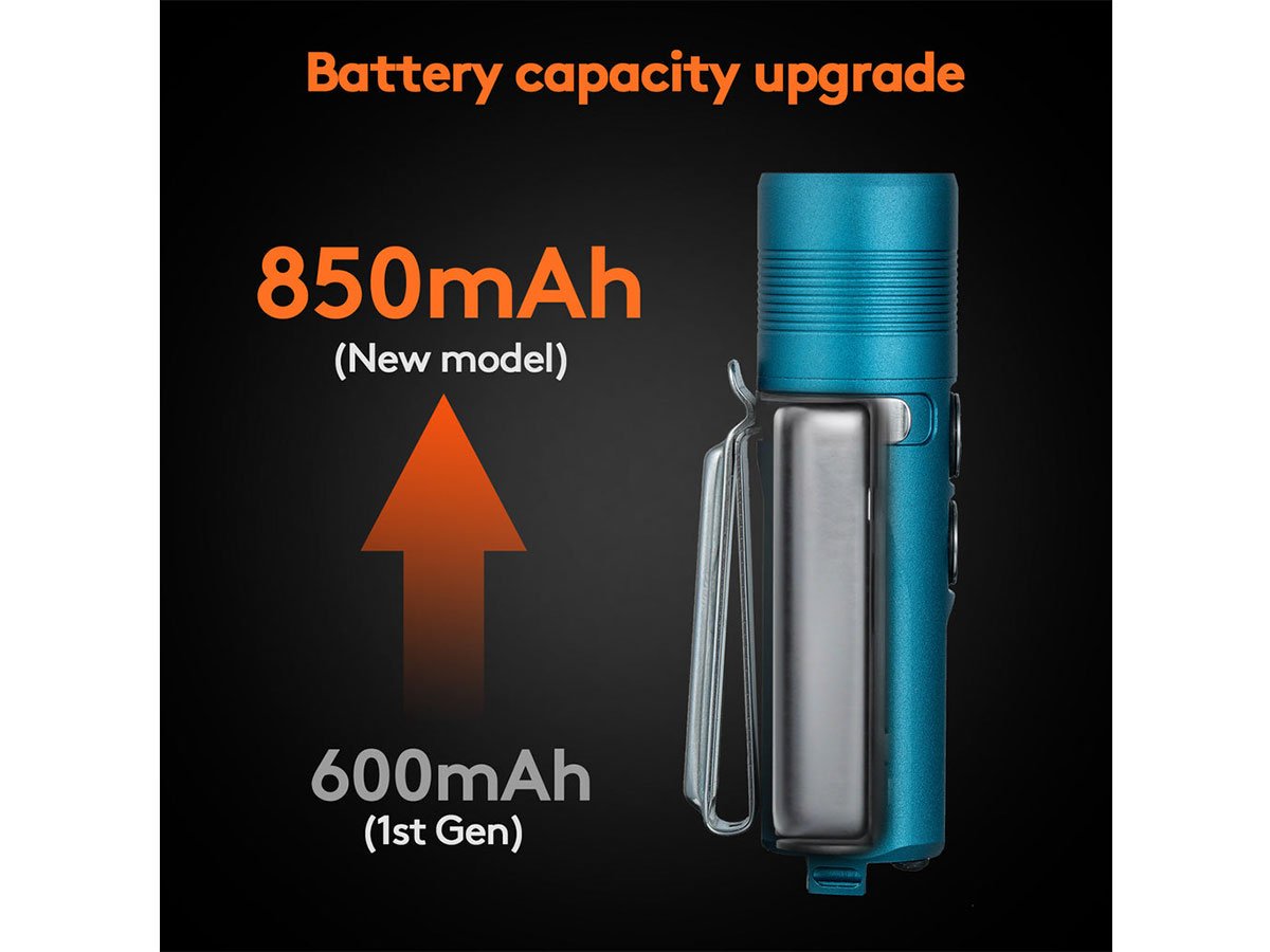 The Gen 2 version of this light improved the capacity of the battery pack, increasing it to 850mAh to best support long runtimes. The light is fully rechargeable via the in-body USB-C charge port, which lets you power up fast and easy so that you can throw the light back on your keyring again.