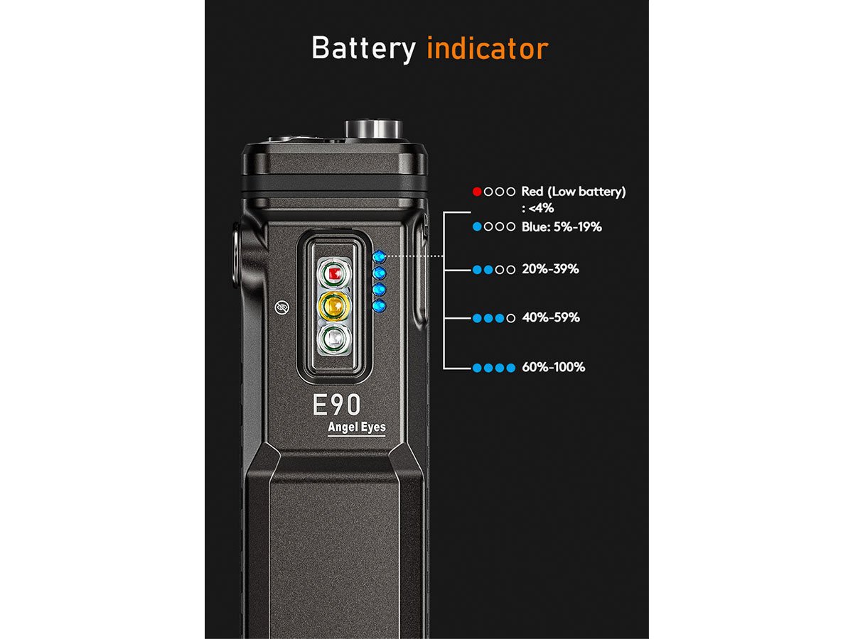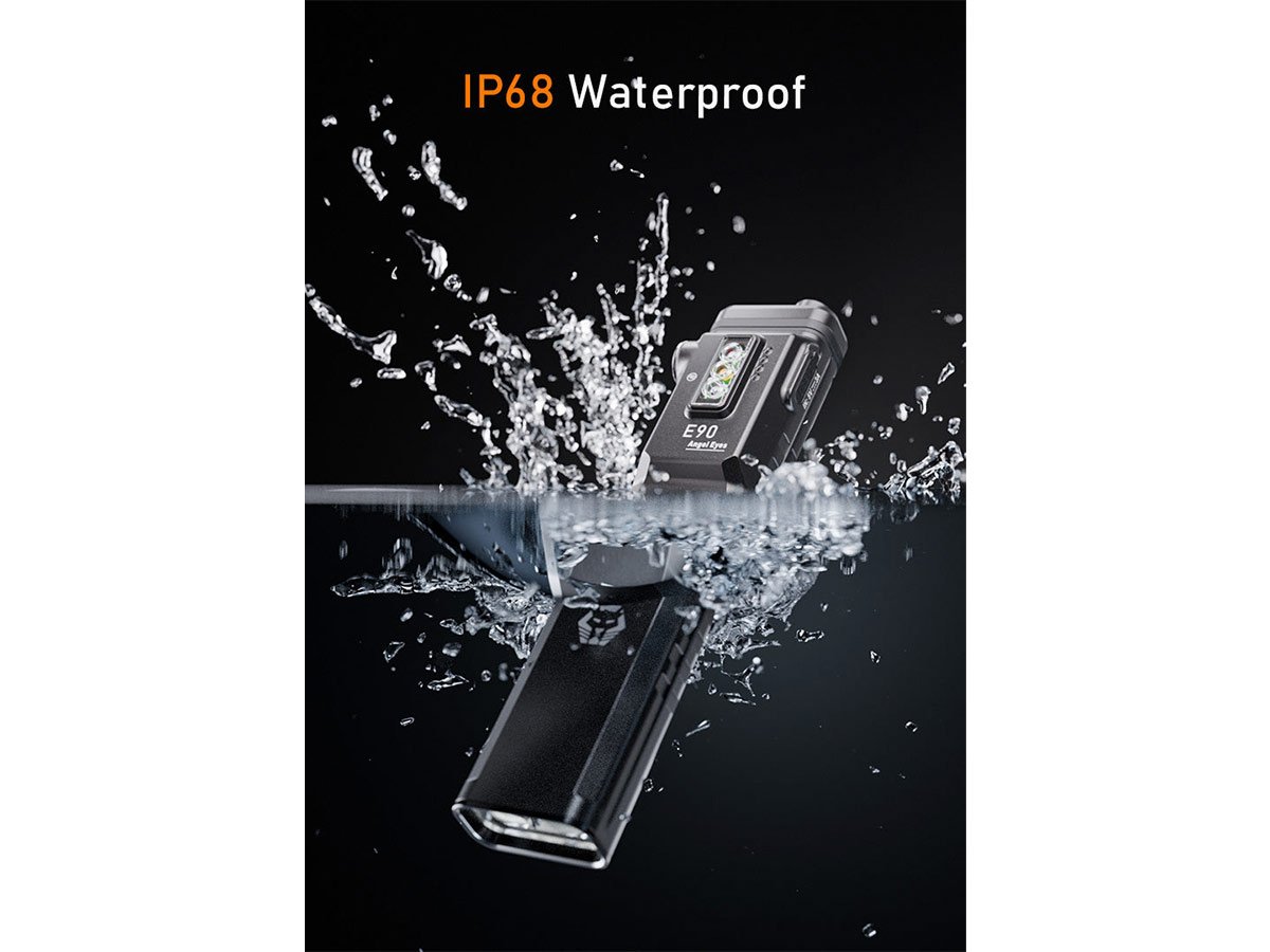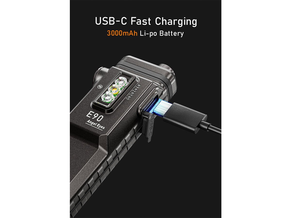 The E90 is designed with user-friendly features. It includes a lockout mode to prevent accidental activation in a bag or pocket, and preserve battery life. A proximity sensor adjusts the light output when it detects objects too close on medium, high, or turbo settings, returning to its original mode when the distance increases. This ensures optimal performance, conserves battery, and enhances user safety. The E90 has a 3000mAh lithium-polymer battery pack, with a high capacity to deliver long runtimes. It has a built-in USB-C charge port, for simple recharging from sources like wall chargers, laptops, and more. For added portability, it features a removeable pocket clip with screws, letting you attach it to hats, bags, or simply slip it into your pocket.