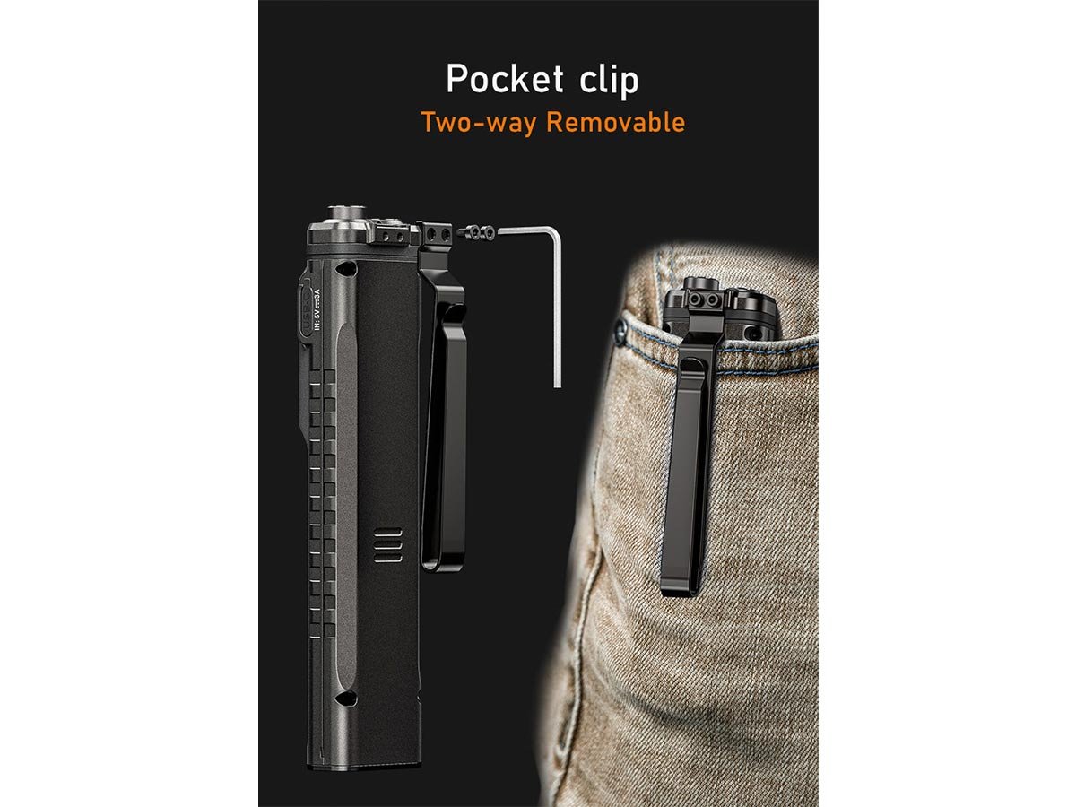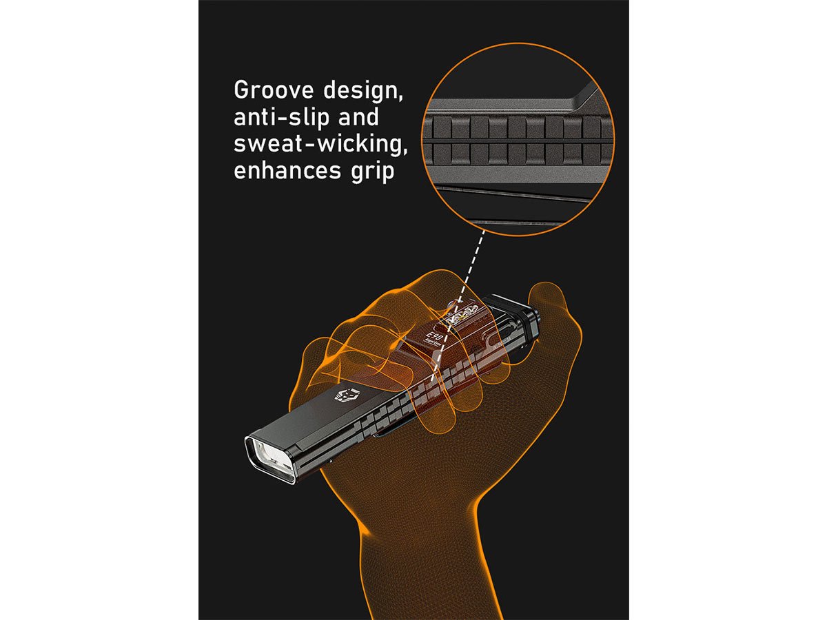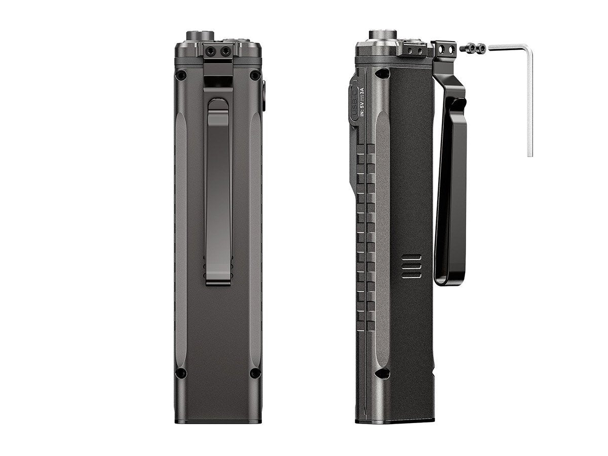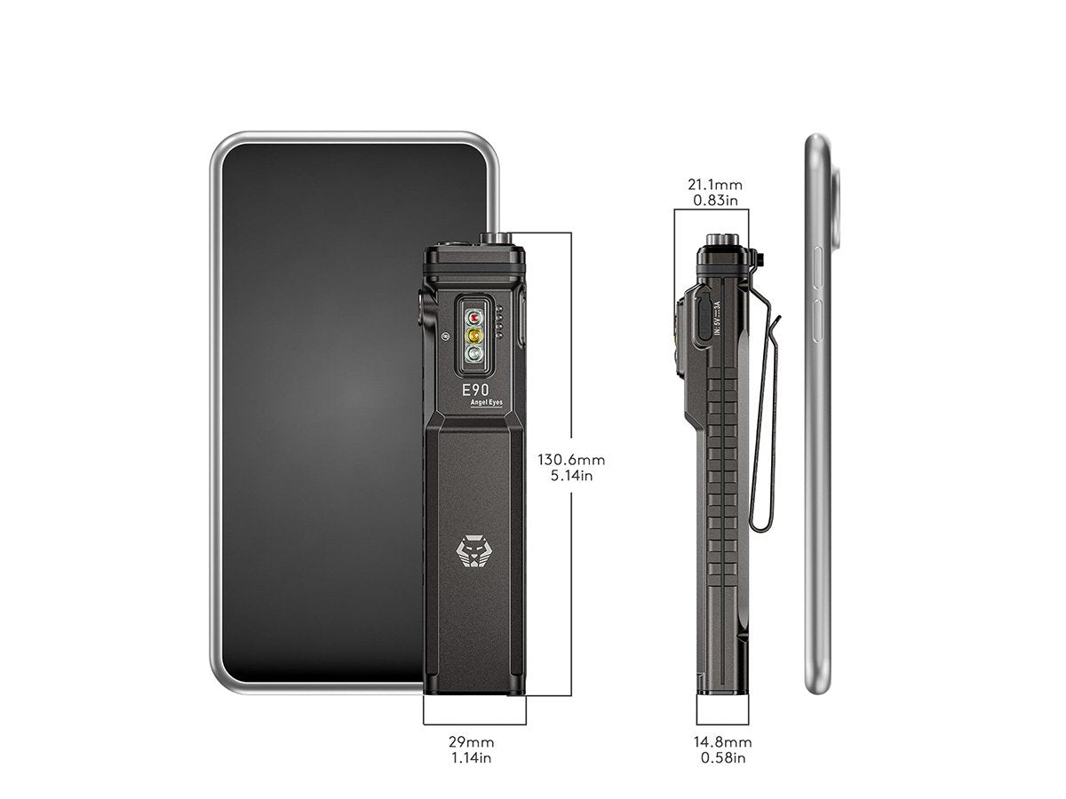 The E90 is designed with user-friendly features. It includes a lockout mode to prevent accidental activation in a bag or pocket, and preserve battery life. A proximity sensor adjusts the light output when it detects objects too close on medium, high, or turbo settings, returning to its original mode when the distance increases. This ensures optimal performance, conserves battery, and enhances user safety. The E90 has a 3000mAh lithium-polymer battery pack, with a high capacity to deliver long runtimes. It has a built-in USB-C charge port, for simple recharging from sources like wall chargers, laptops, and more. For added portability, it features a removeable pocket clip with screws, letting you attach it to hats, bags, or simply slip it into your pocket.