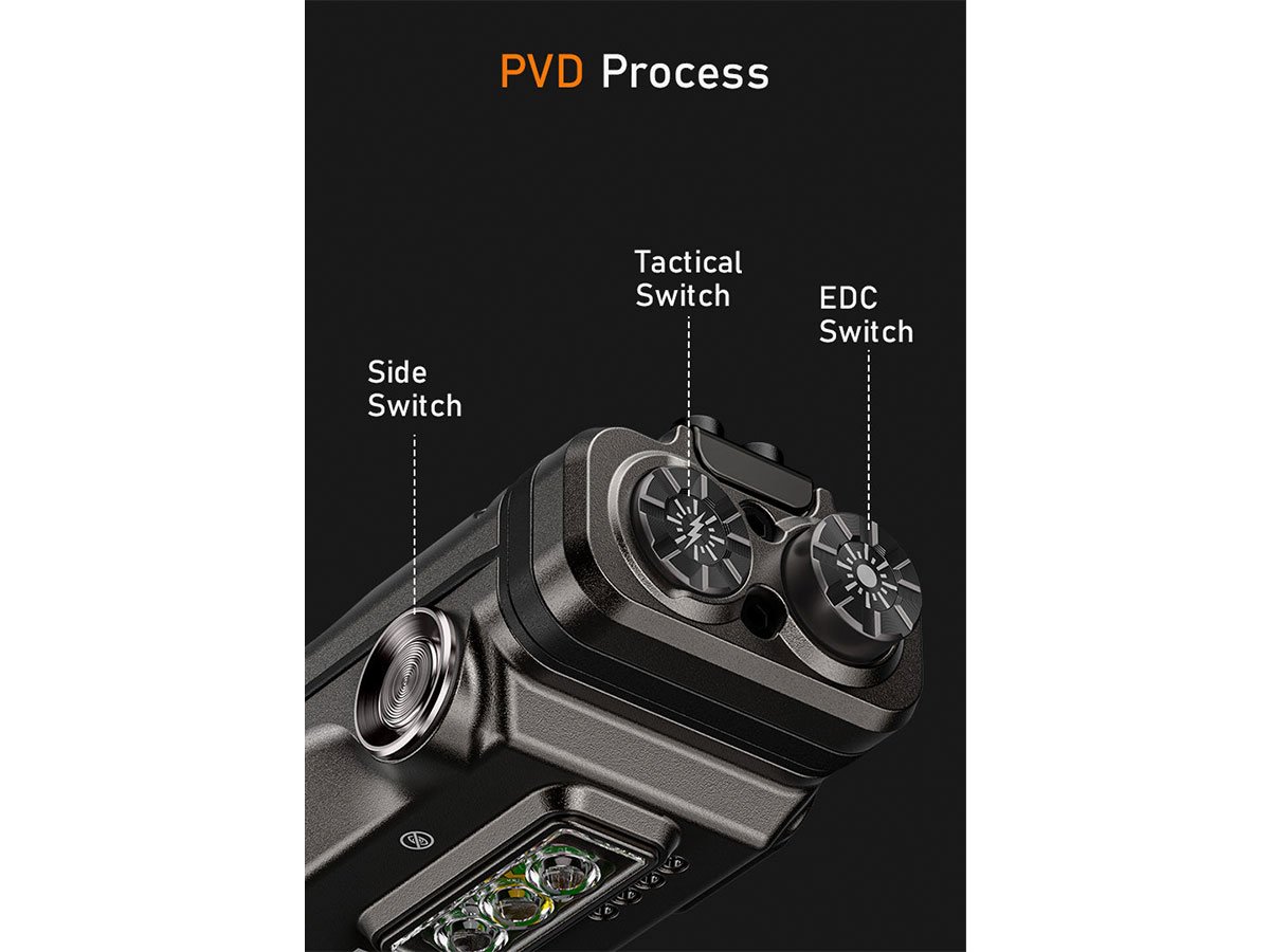 - » 3 switches - EDC, Tactical, Side, provide instant access to lighting modes for reliable illumination
