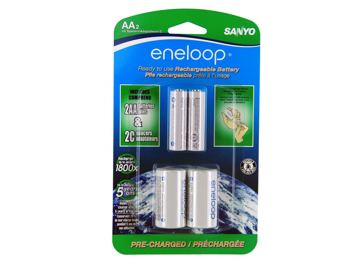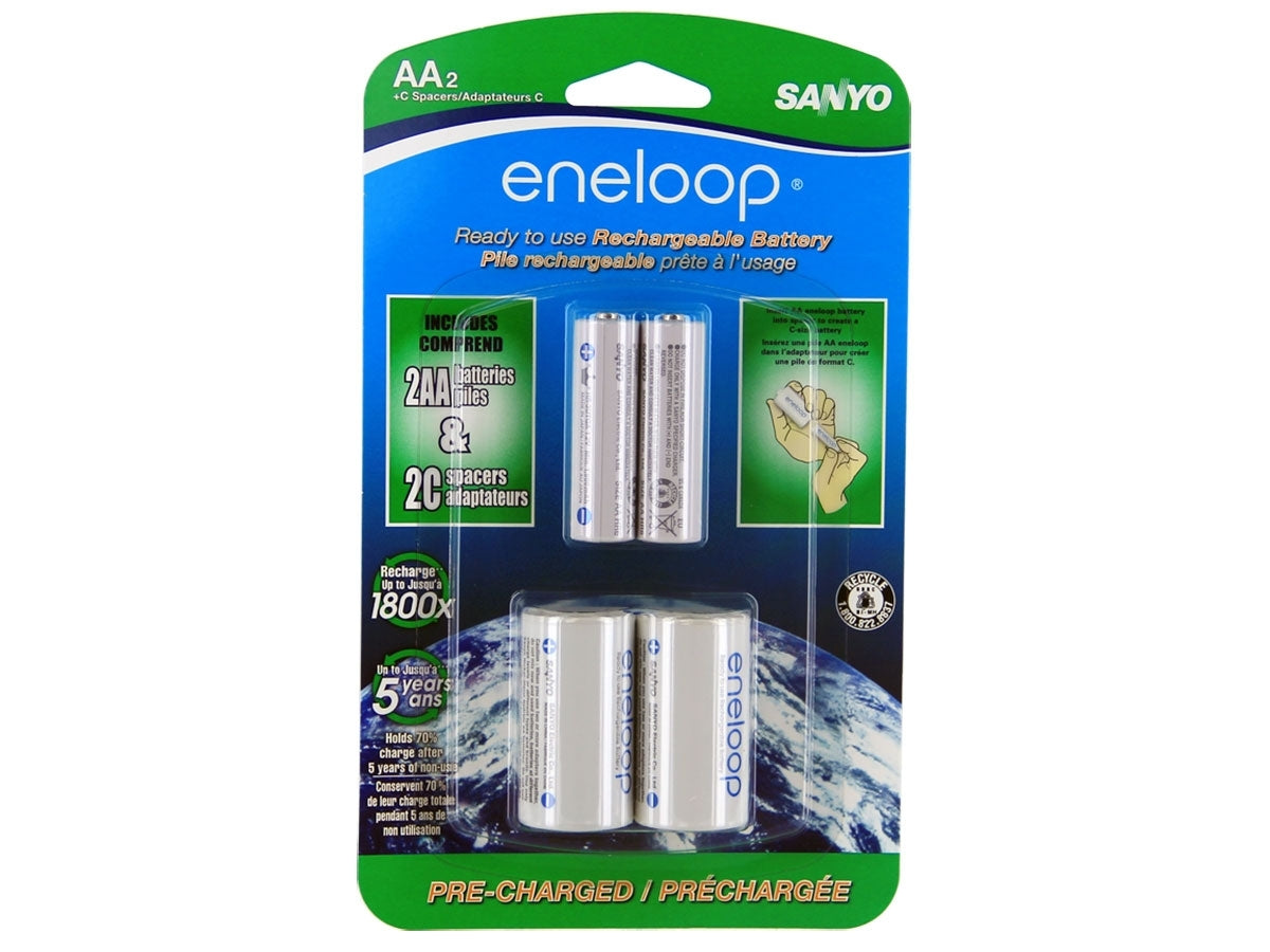 This package comes with two C-cell spacers, allowing you to use your AA batteries in devices that typically take C sized batteries. Simply insert your Eneloop AA into the spacer and you're ready to go! Eneloop spacers are safe to use and compatible with all AA batteries.