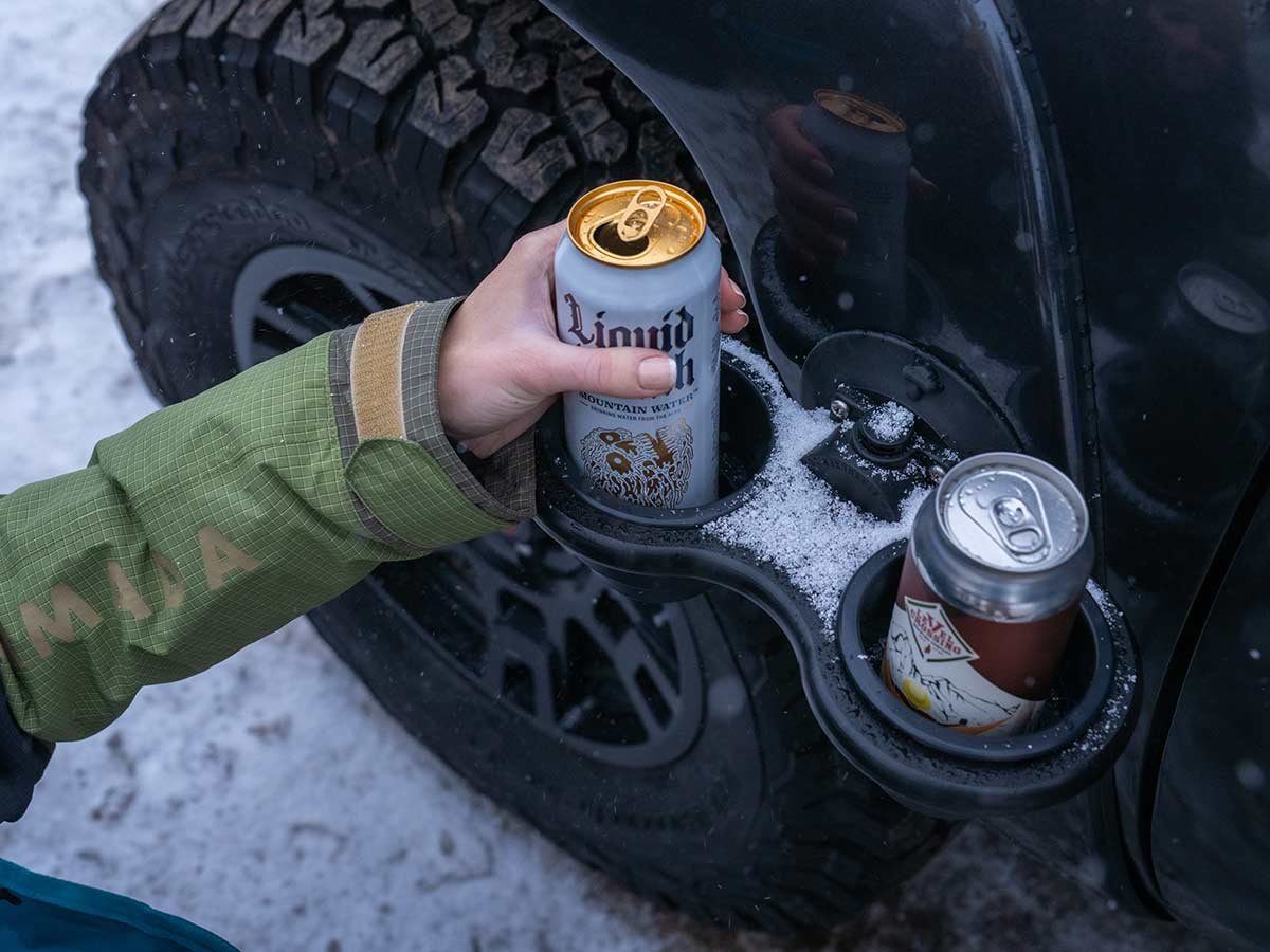 - Can hold drink sizes between beer cans and large Yeti mugs