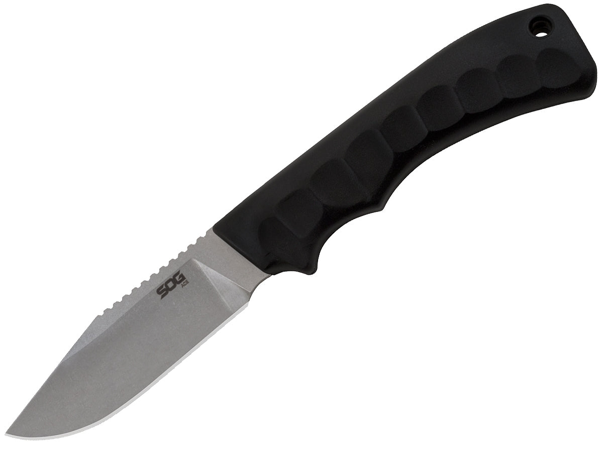 Ergonomically designed, the SOG Ace is a high-quality fixed blade knife perfect for a wide range of applications. This impressive knife features a 3.8" clip point blade made from high-strength 7CR17MOV steel perfect for slicing kindling, cutting cord, clearing brush, and other outdoor activities. The straight edge blade is extremely wear and chip resistant and comes with a stylish stone wash finish. The Ace's thermoplastic rubber handle is designed with textured grooves that help provide a secure hold so you never lose your grip while using it. The knife comes with a plastic sheath with a built-in pocket clip for a safer and more secure carry.