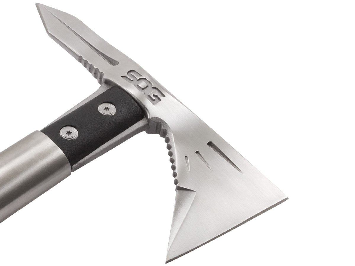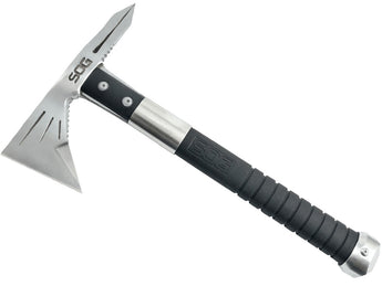 Small enough to be an easy carry and powerful enough to tackle a wide range of tasks, the SOG Voodoo Hawk Mini is the perfect axe for any outdoor enthusiast. Just over a foot in length, this slightly smaller sibling to the Voodoo Hawk is made from remarkably sturdy 3CR13MoV steel that will stand up to any task. The head of the hatchet features an extended blade on one end and a sharp spike on the other, both featuring specialized cutouts that reduce friction while chopping, cutting, or piercing. The head is firmly bolted to the Voodoo Hawk Mini's glass-reinforced nylon handle, which provides a comfortable, secure grip for its user. The Voodoo Hawk Mini is available in a Satin or Black finish and includes a durable ballistic nylon sheath that can be clipped to your belt or gear for convenient, safe storage.