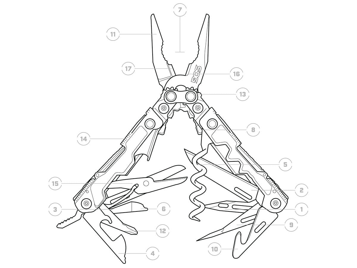 | Multi-Tool Tools | 1/4\ Hex Bit Driver, Awl, Bottle Opener, Can Opener, Corkscrew with Assist, Flat Head Screwdriver, Gripper, Jewlery Driver, Line Cutter, Needlenose Pliers, Phillips Screwdriver, Protractor, Ruler, Scissors, Wire Cutters |